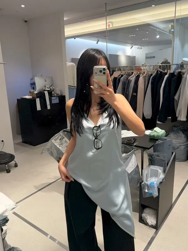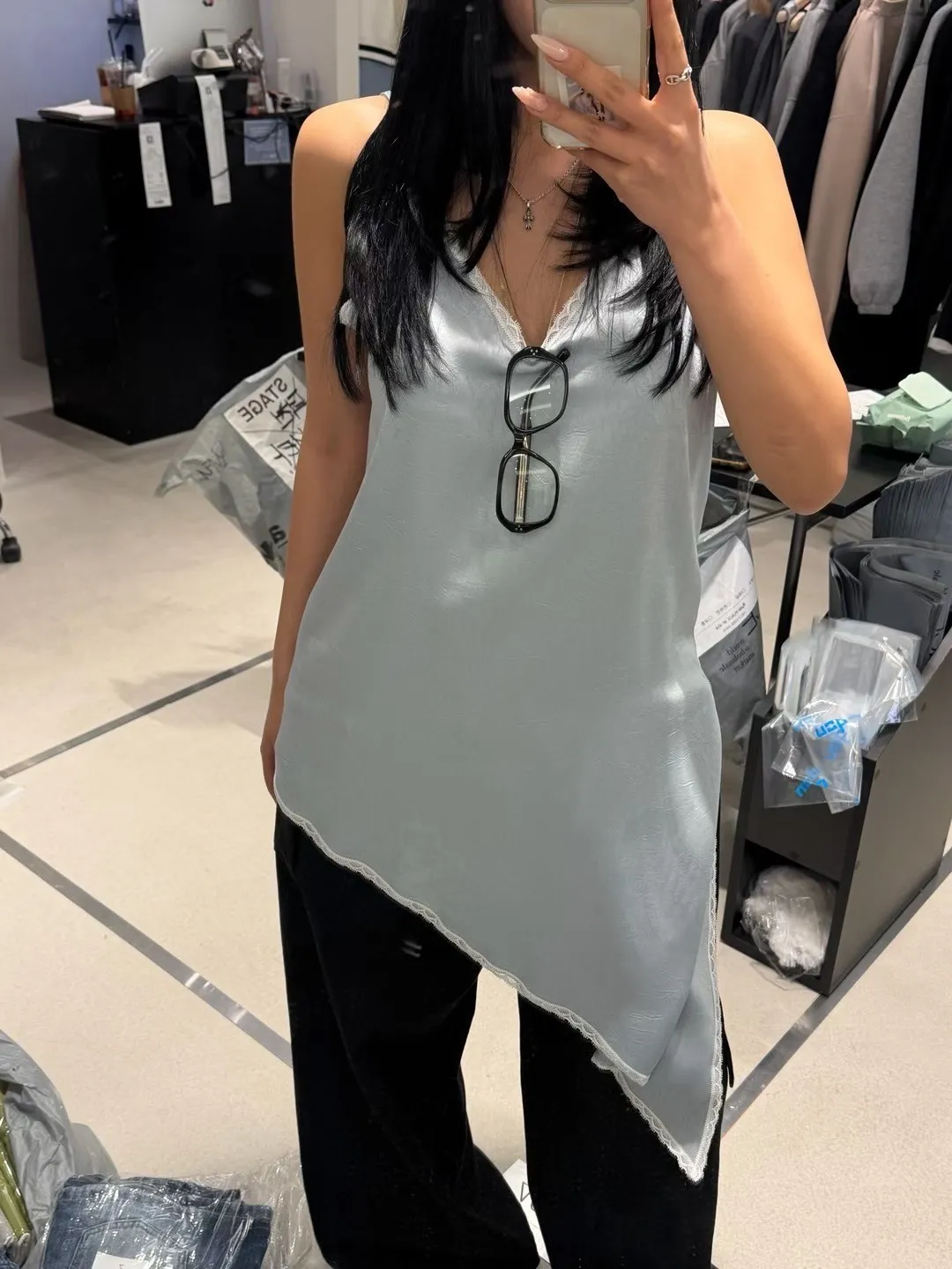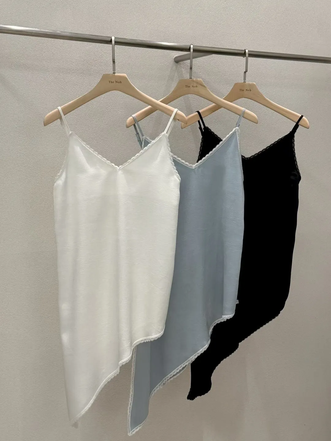 26EC19 長版開岔緞面蕾絲斜切背心 2色