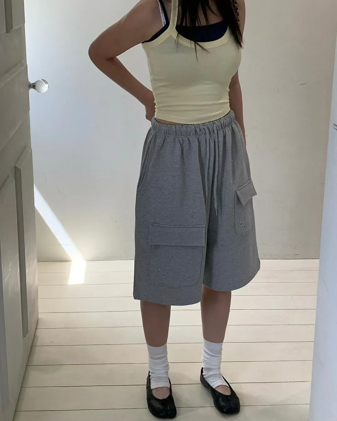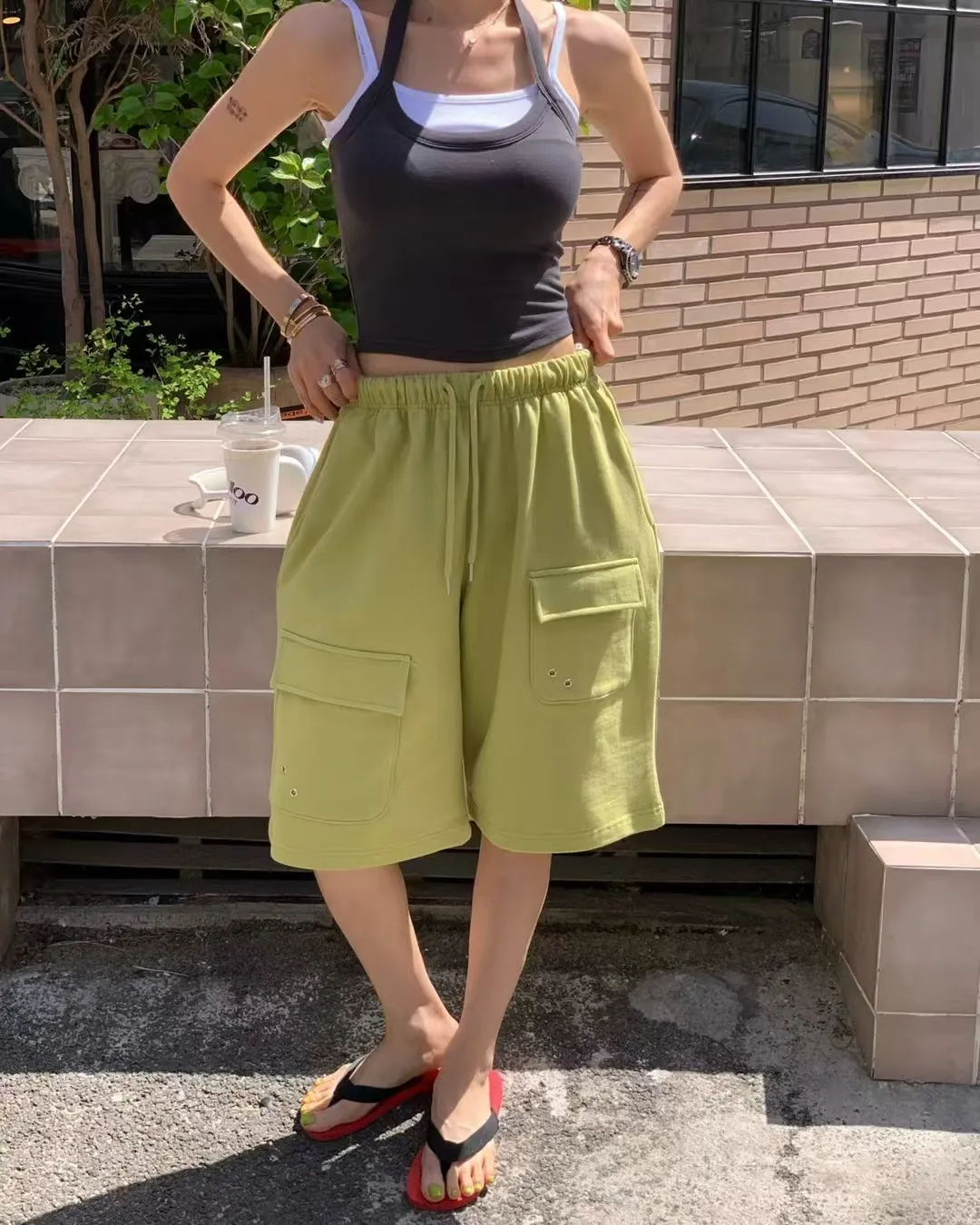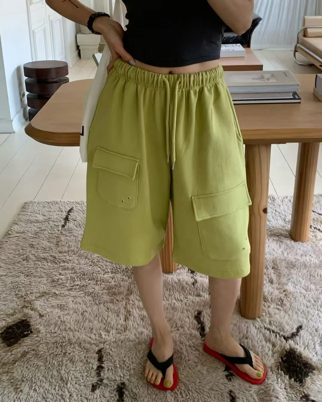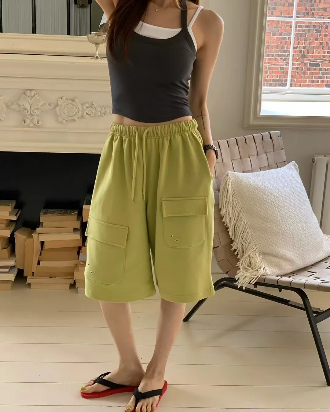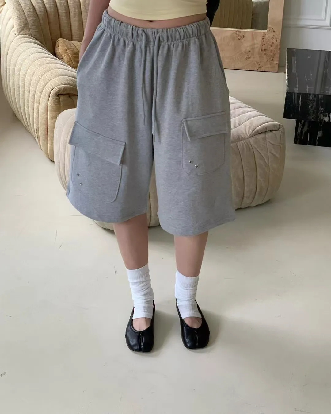 26EG24 薄毛巾六分工裝棉褲 3色