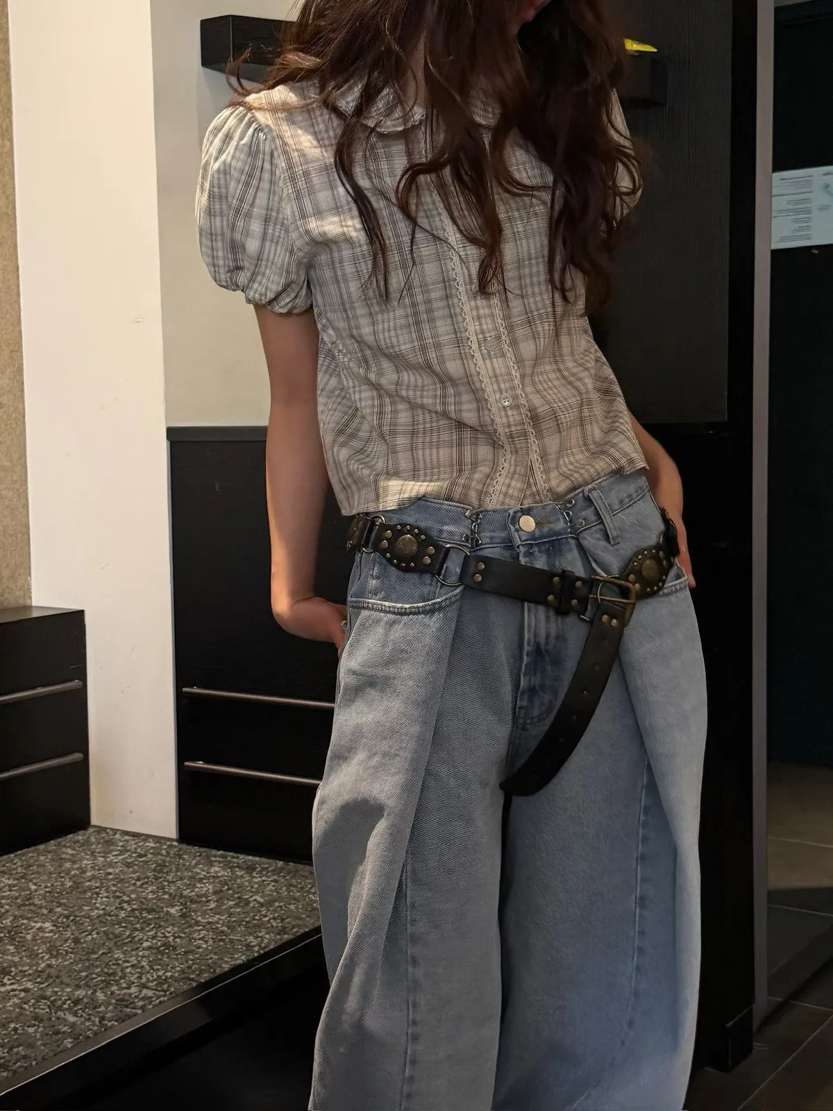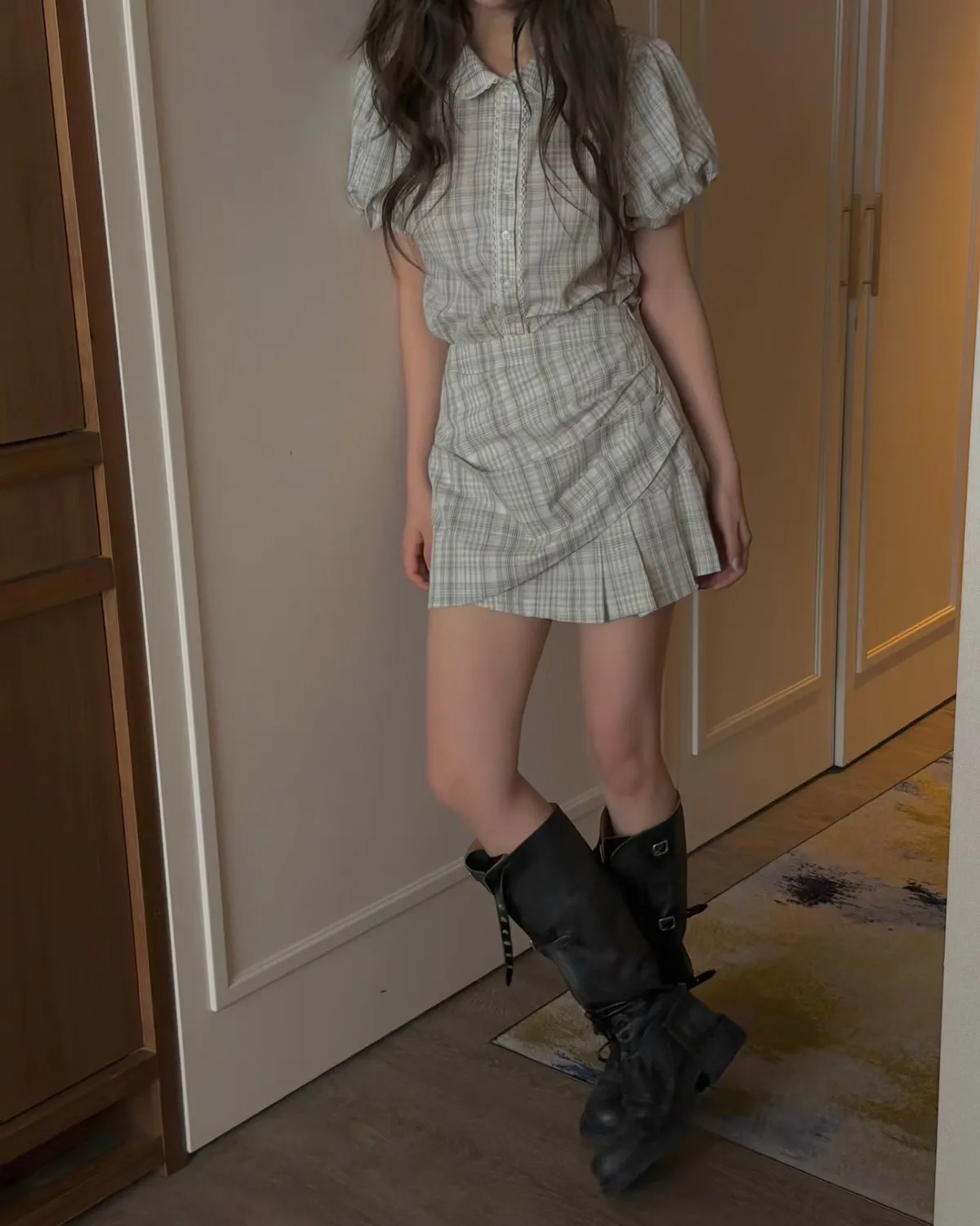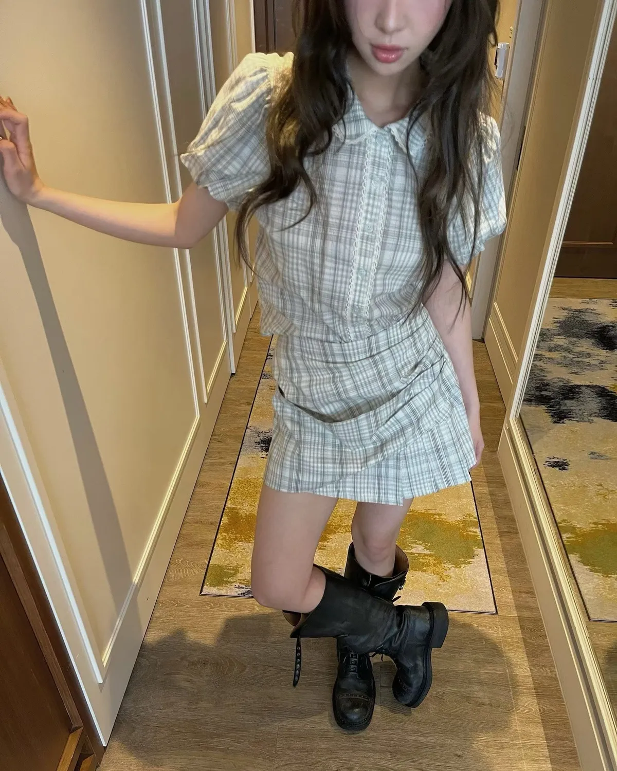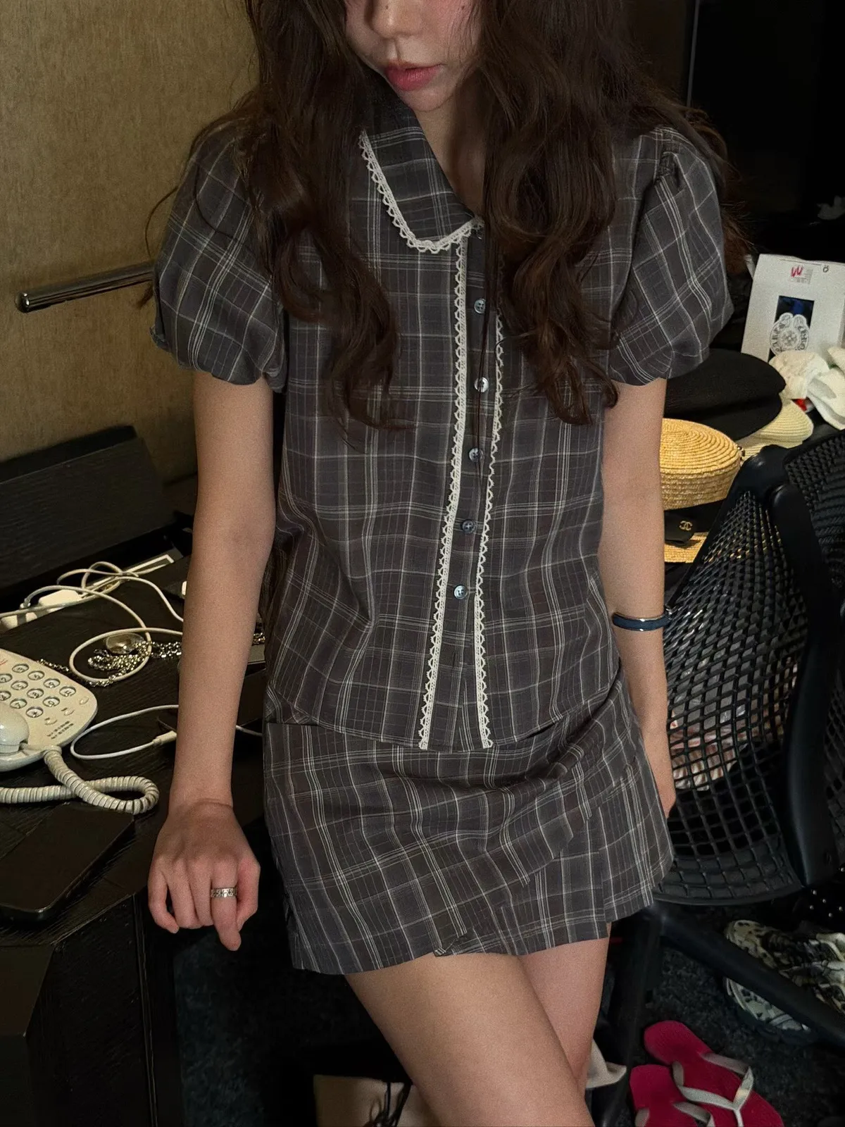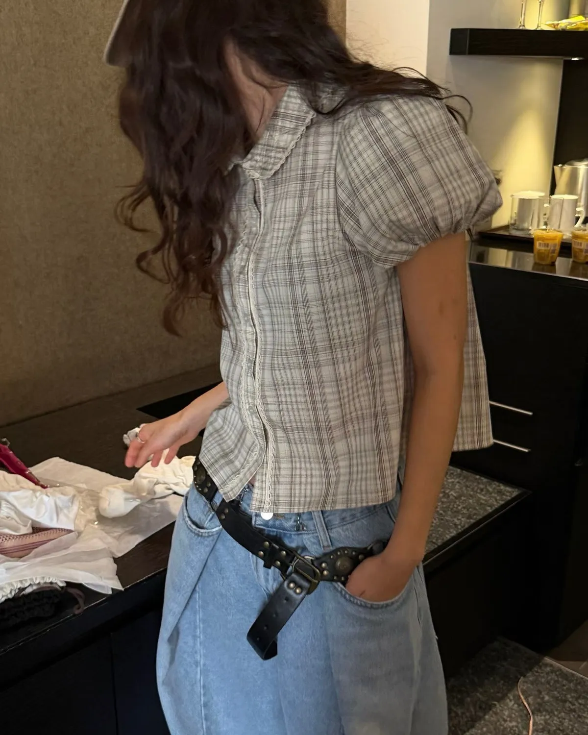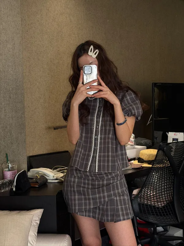 26EH12 短版格紋南瓜袖拼布蕾襯衫 2色