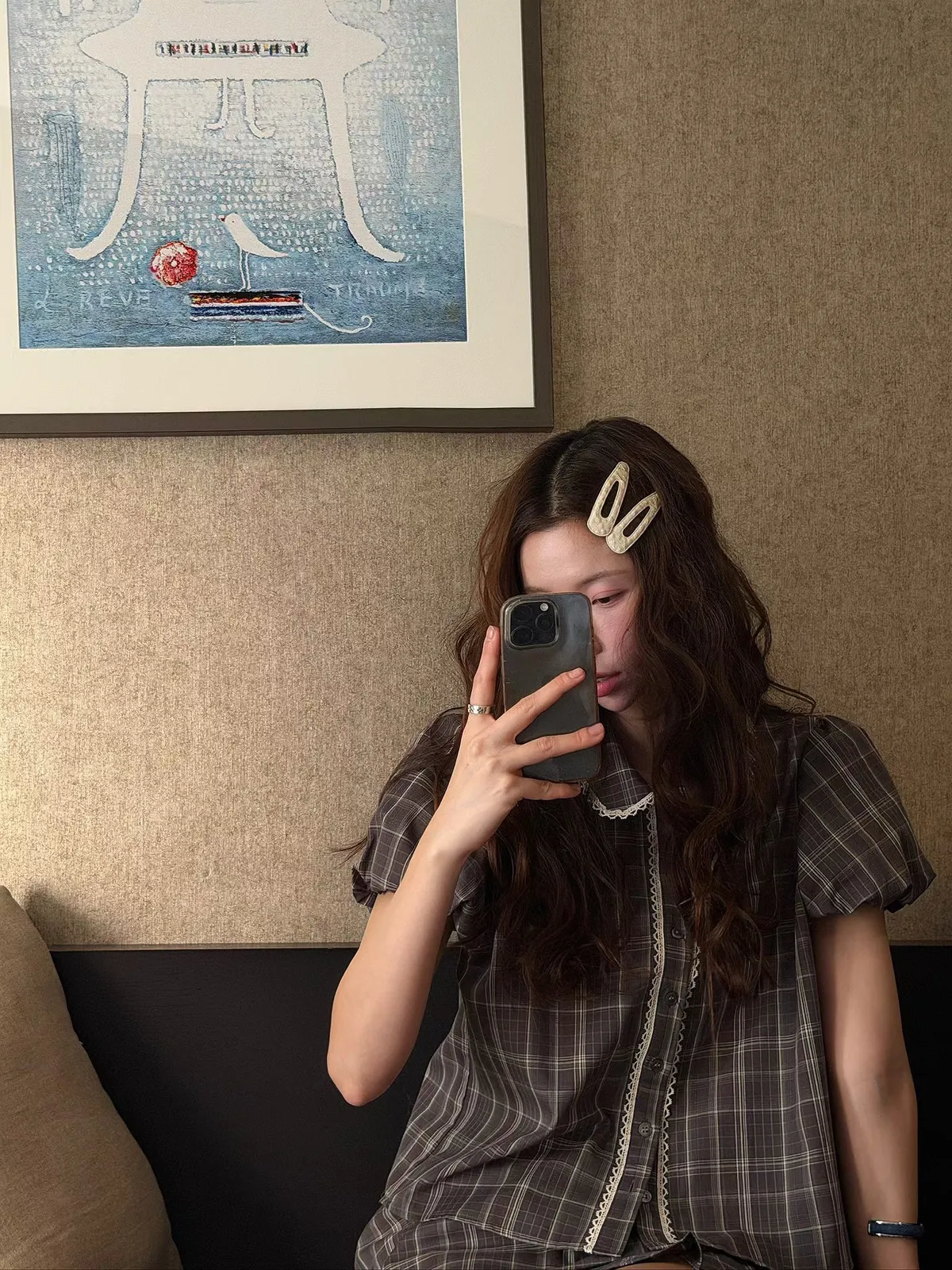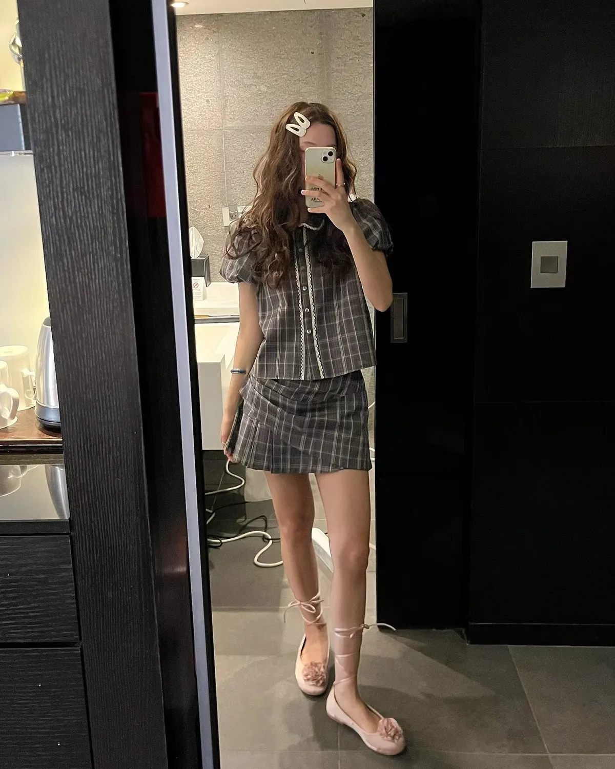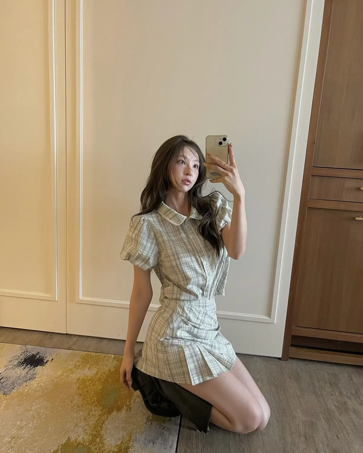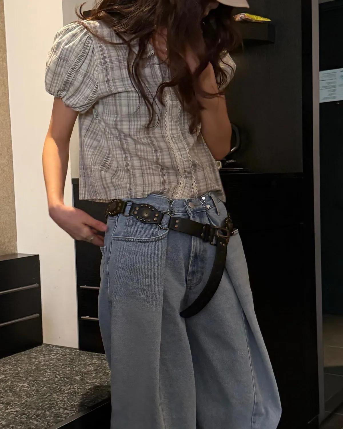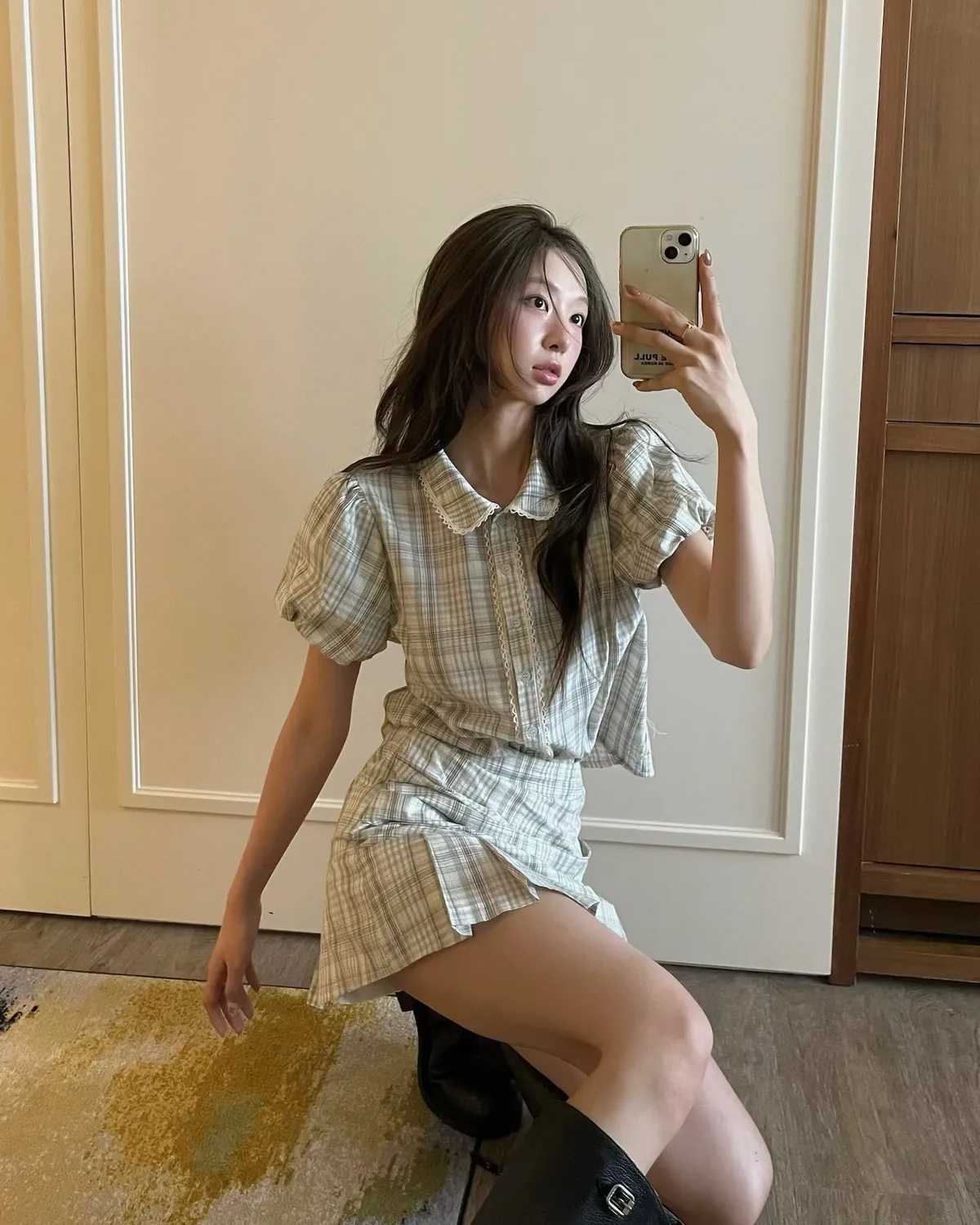 26EH12 短版格紋南瓜袖拼布蕾襯衫 2色