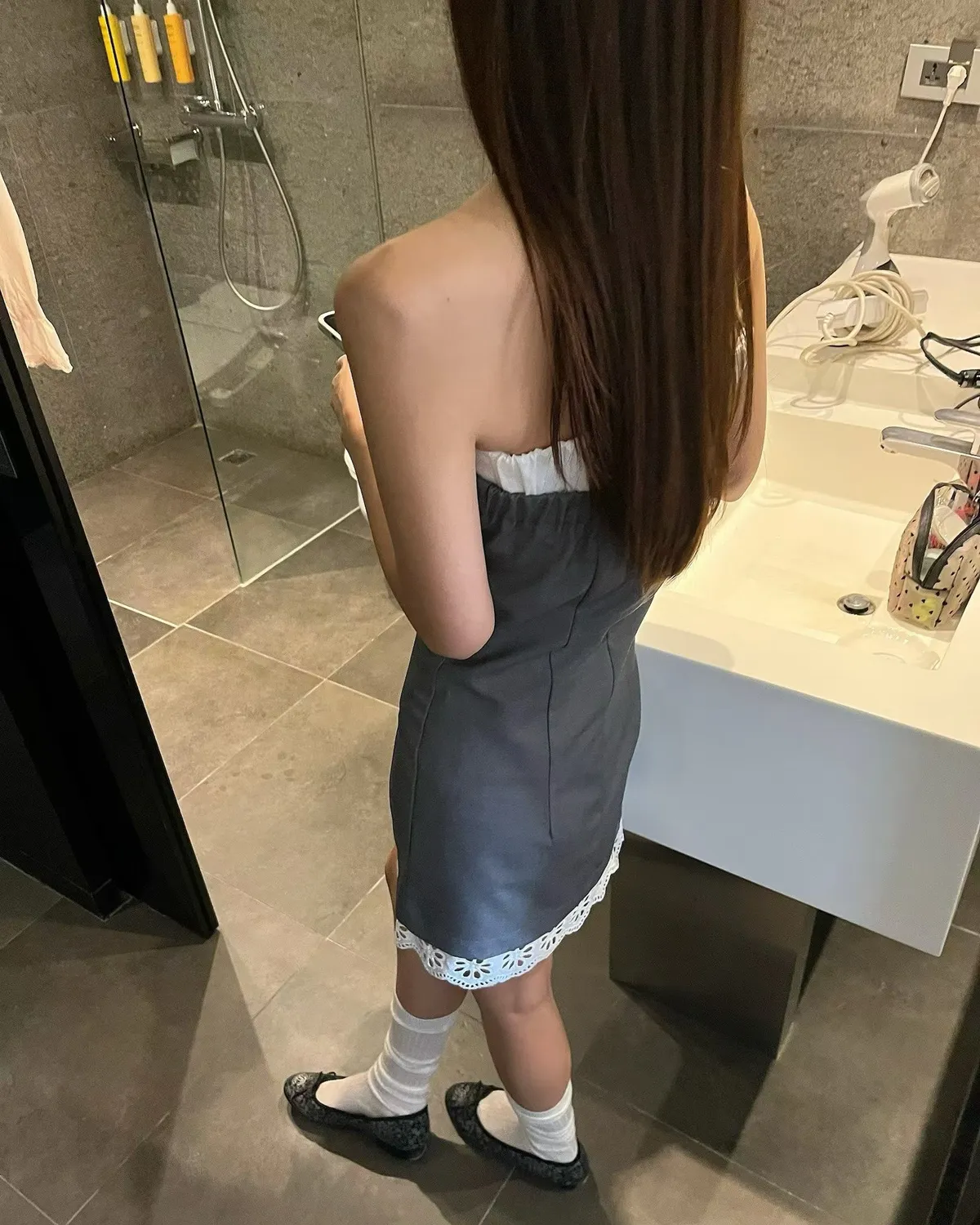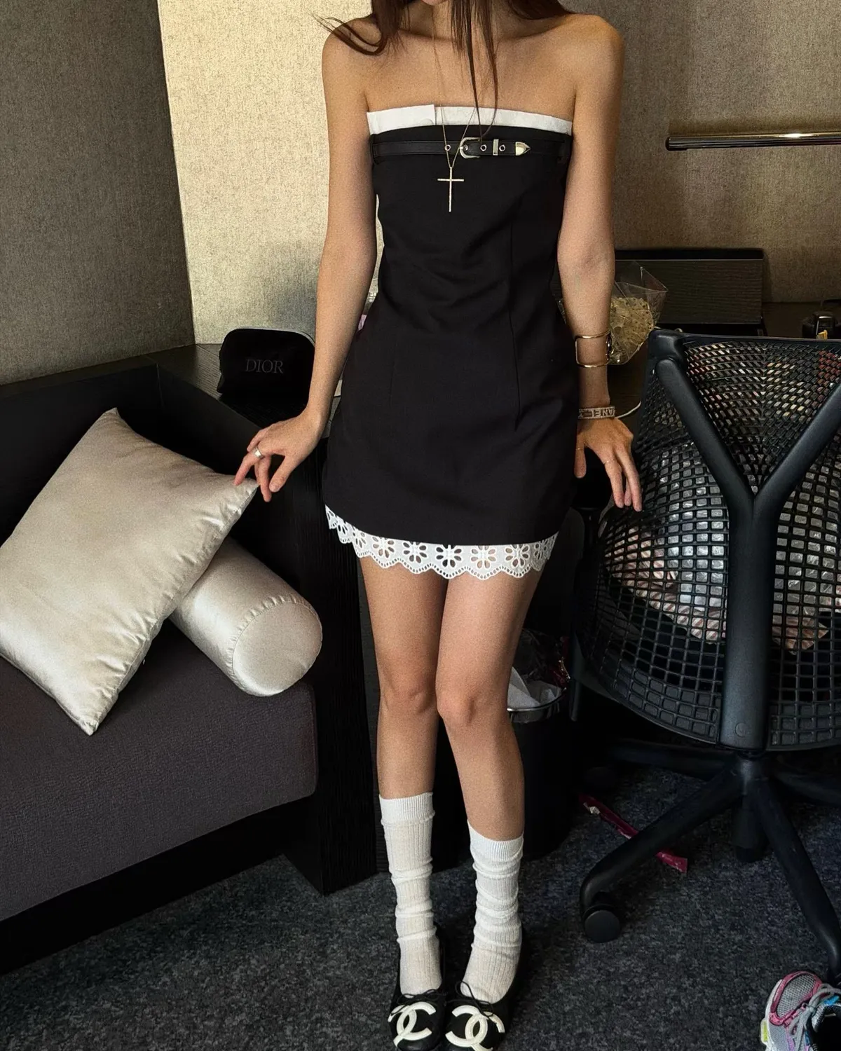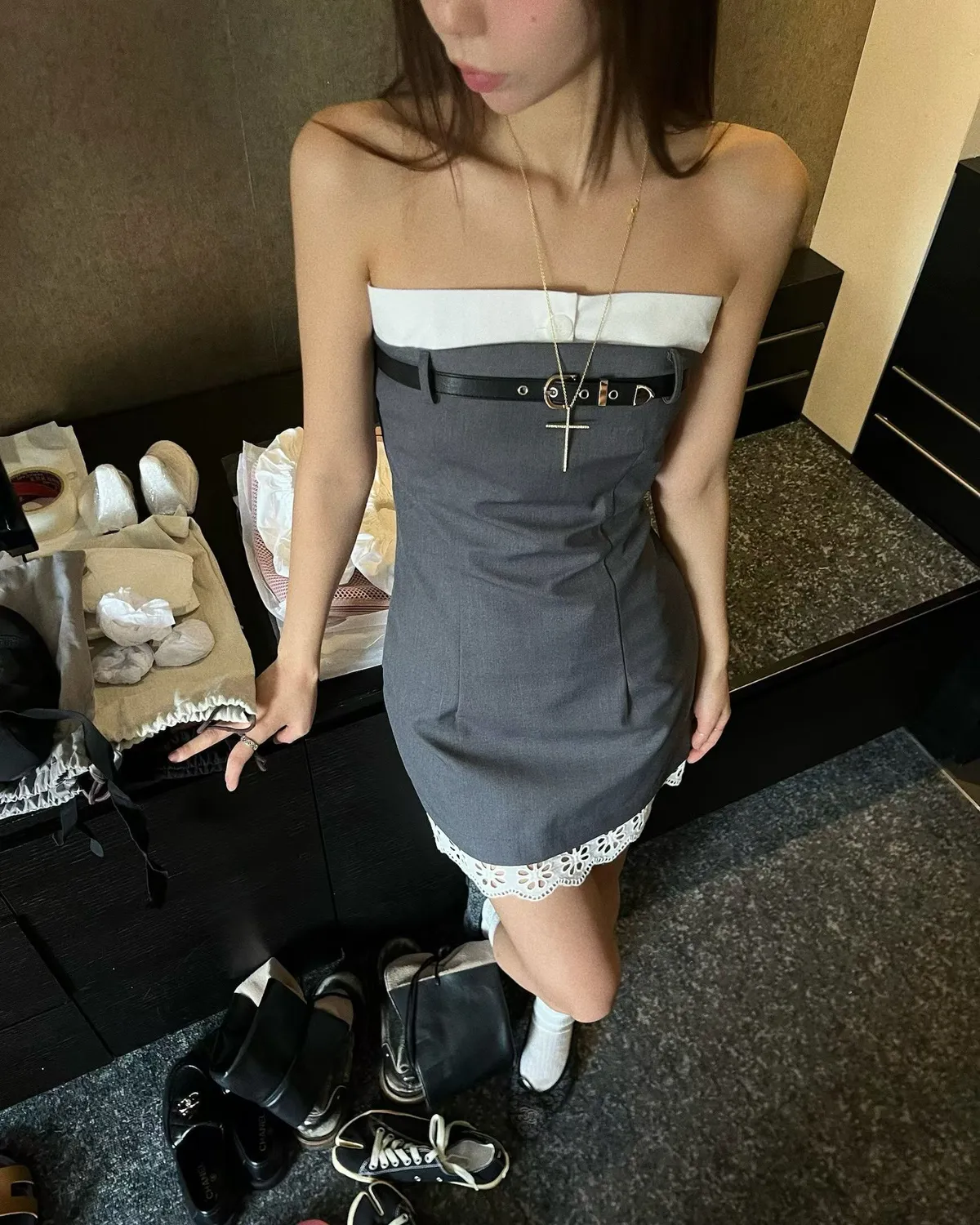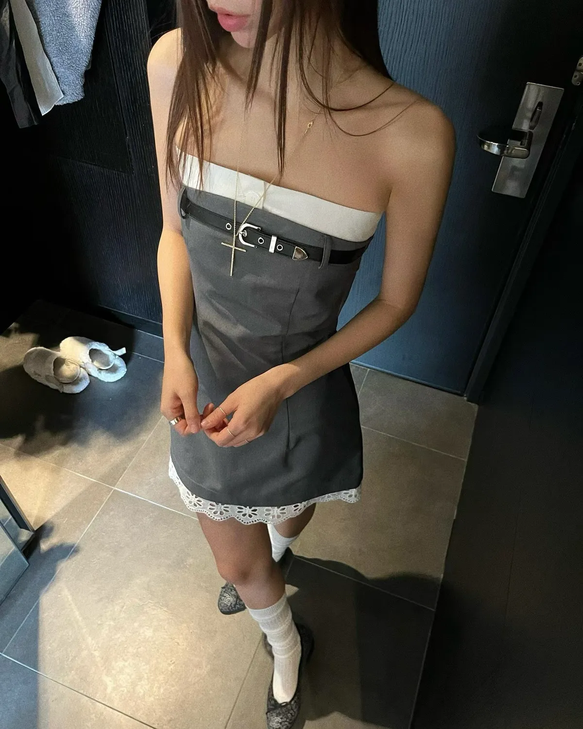 26EH23 平口假兩件布蕾下擺西料短洋裝 2色