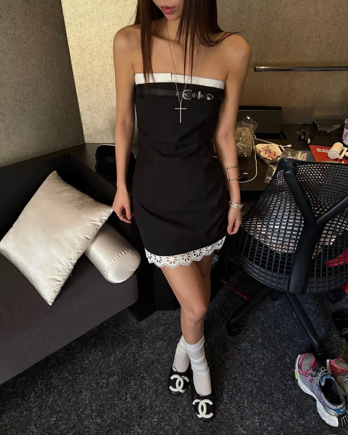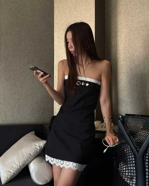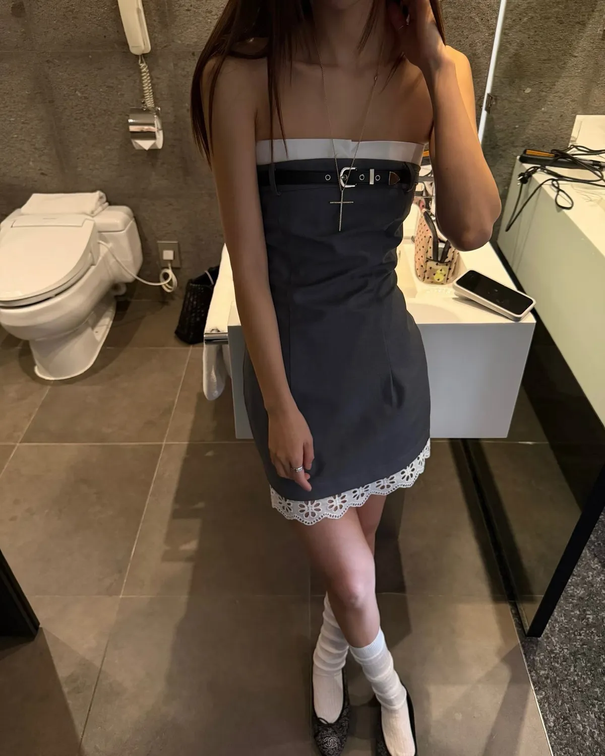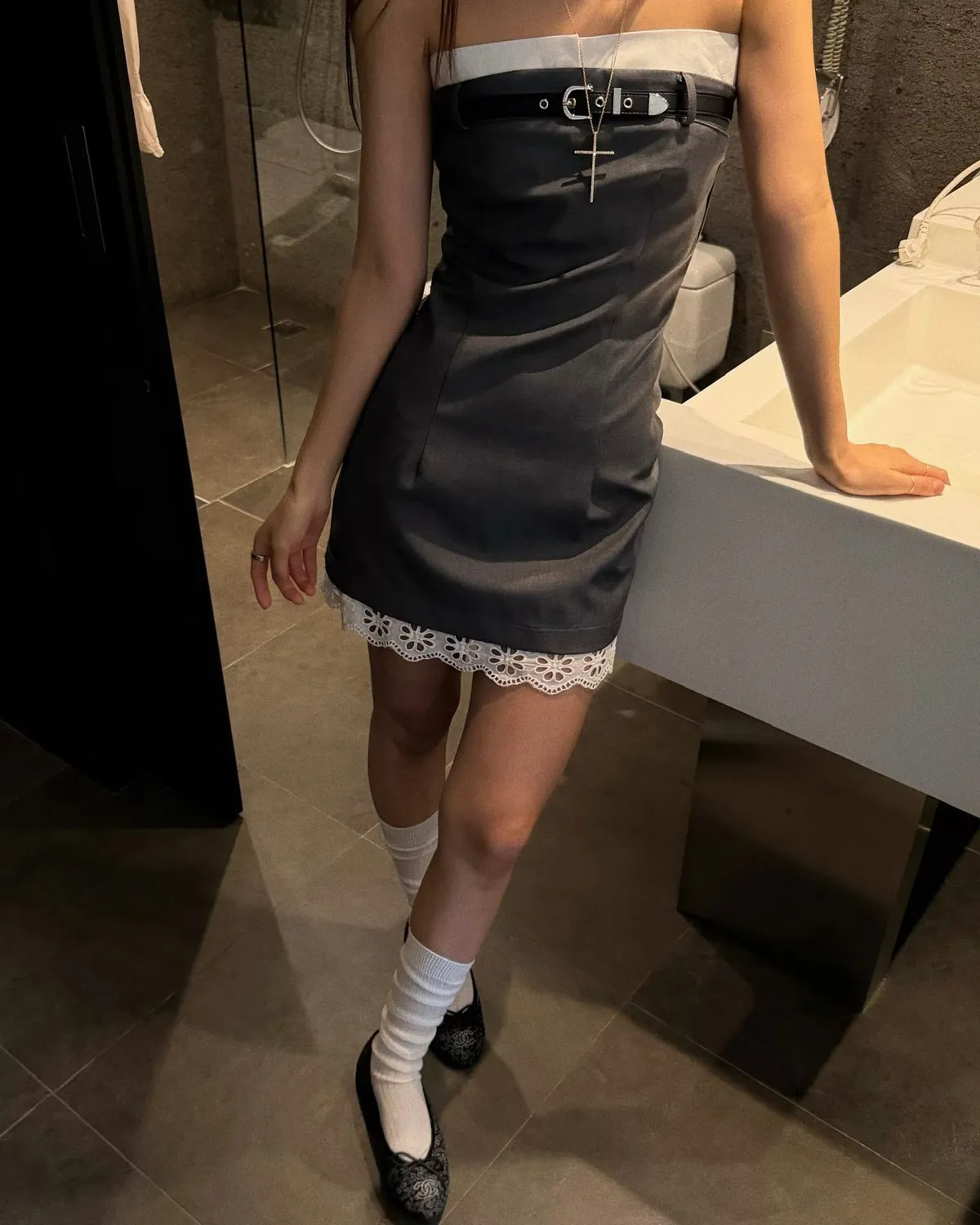 26EH23 平口假兩件布蕾下擺西料短洋裝 2色