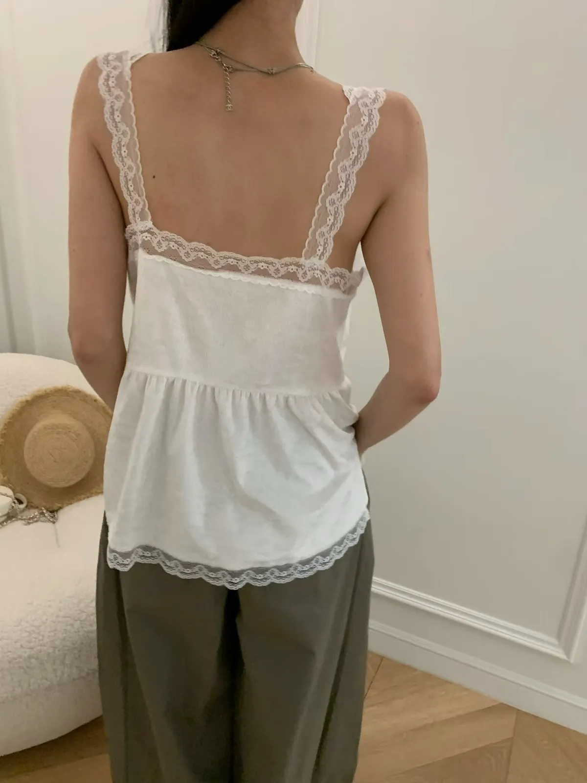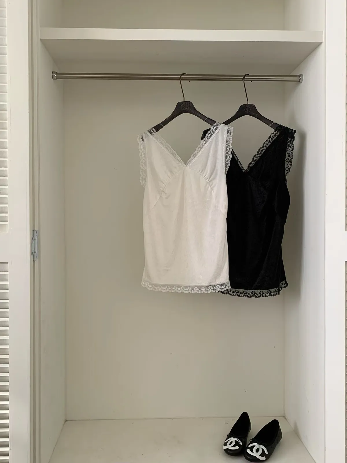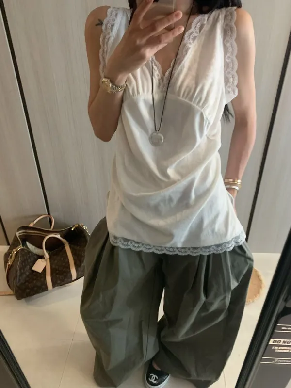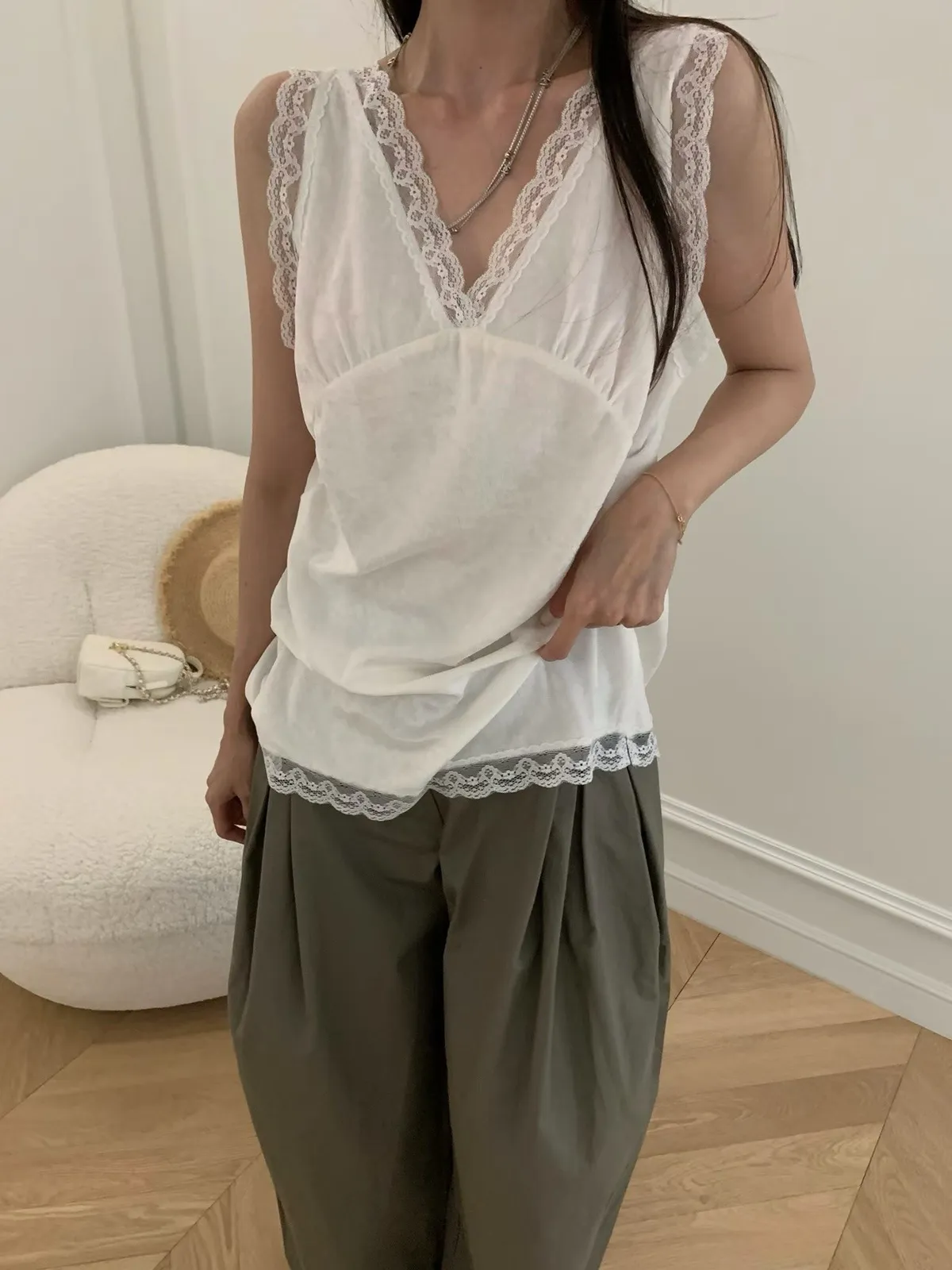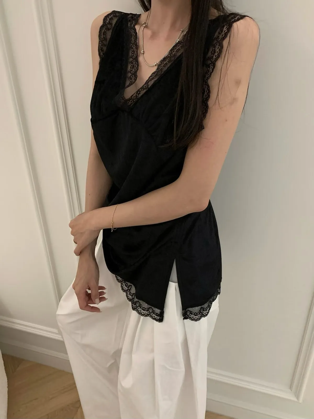 26EI09 V領蜜桃絨拼蕾絲長版背心 2色