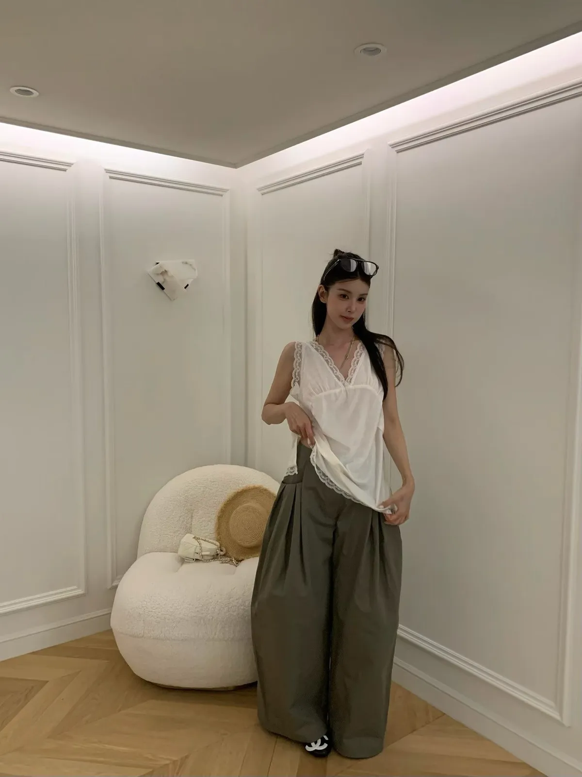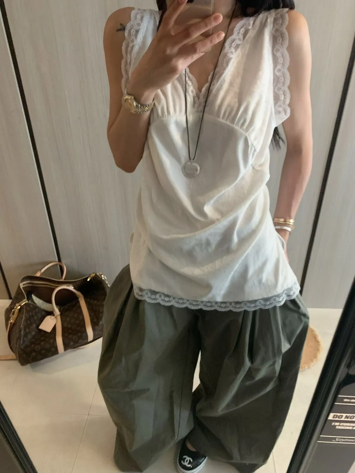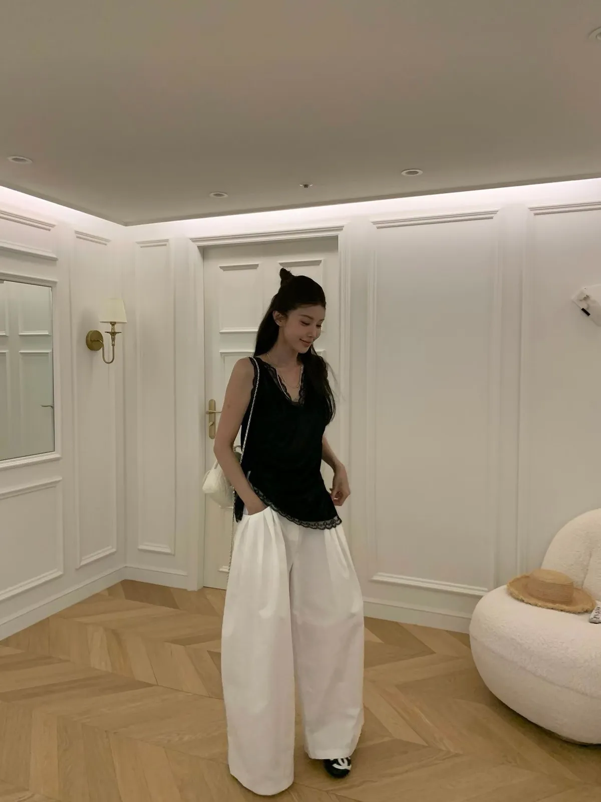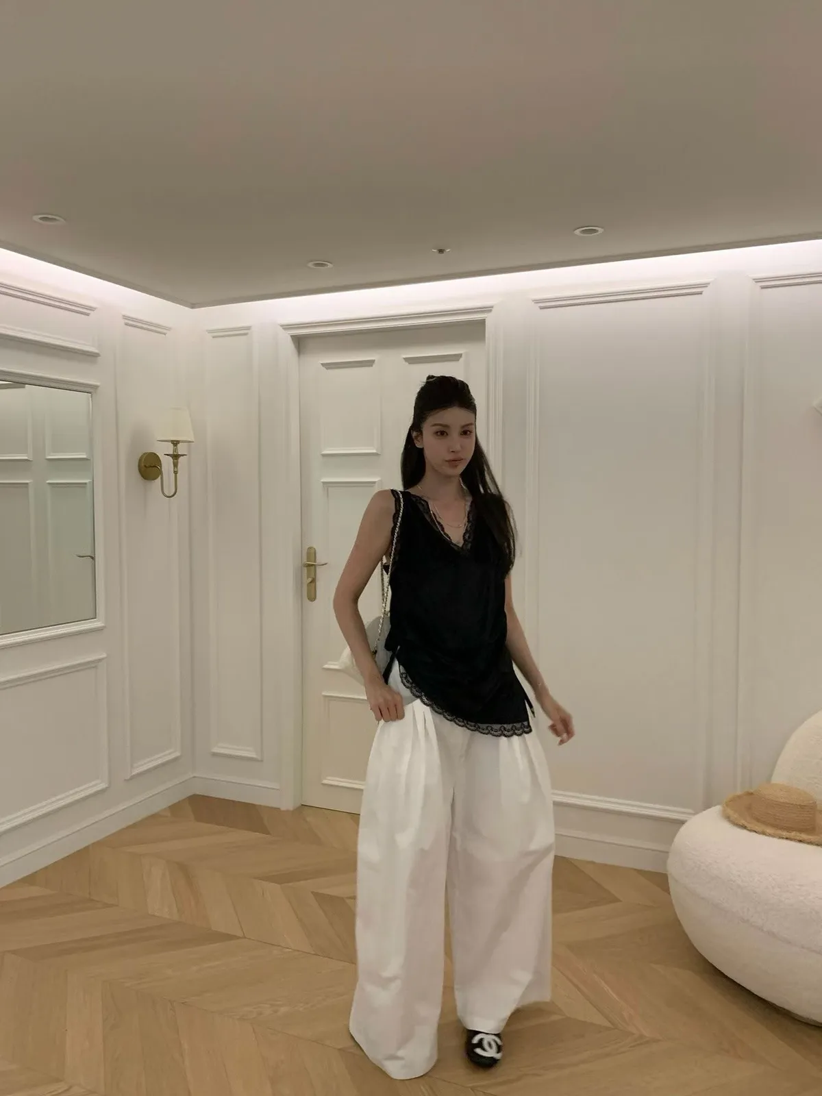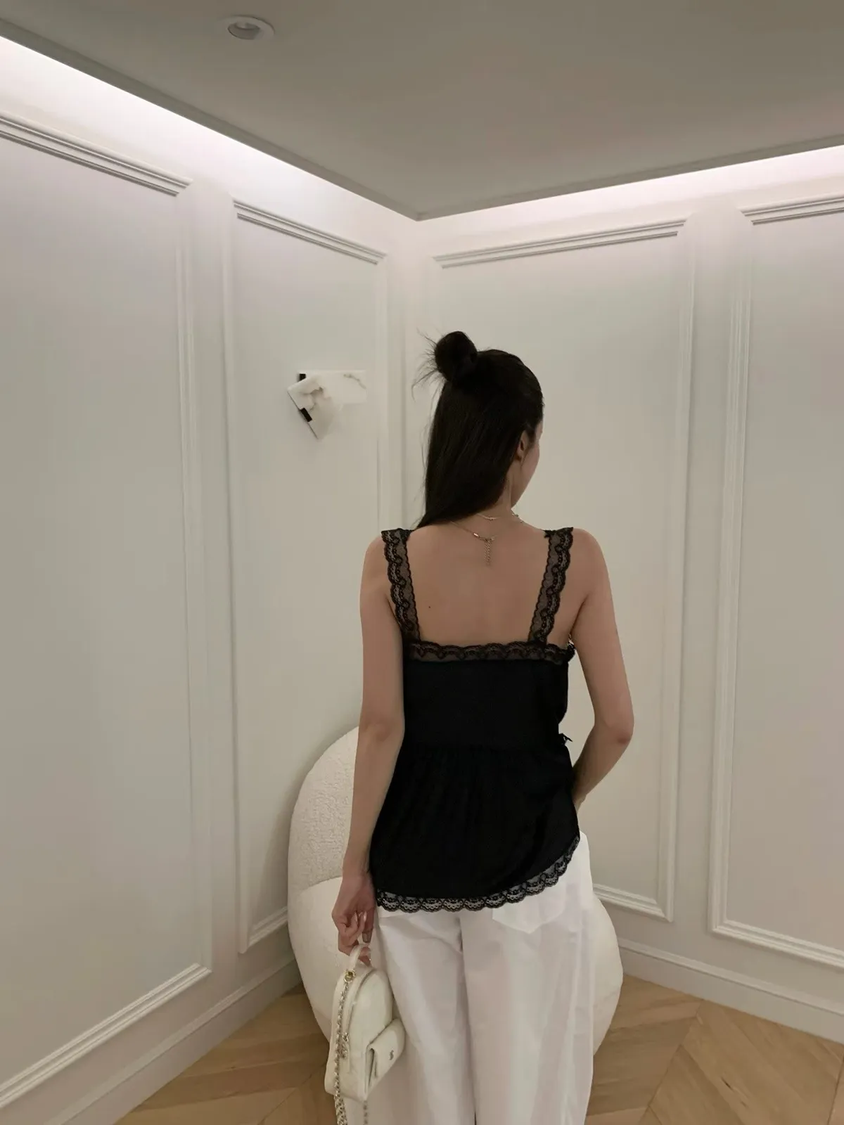 26EI09 V領蜜桃絨拼蕾絲長版背心 2色