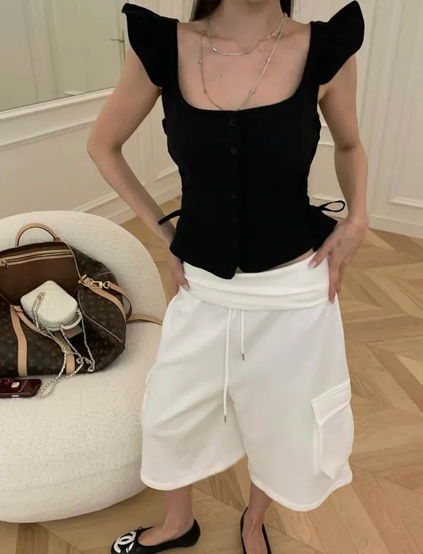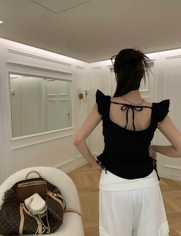 26EI38 後一字帶小袖棉麻側交錯綁帶上衣 3色