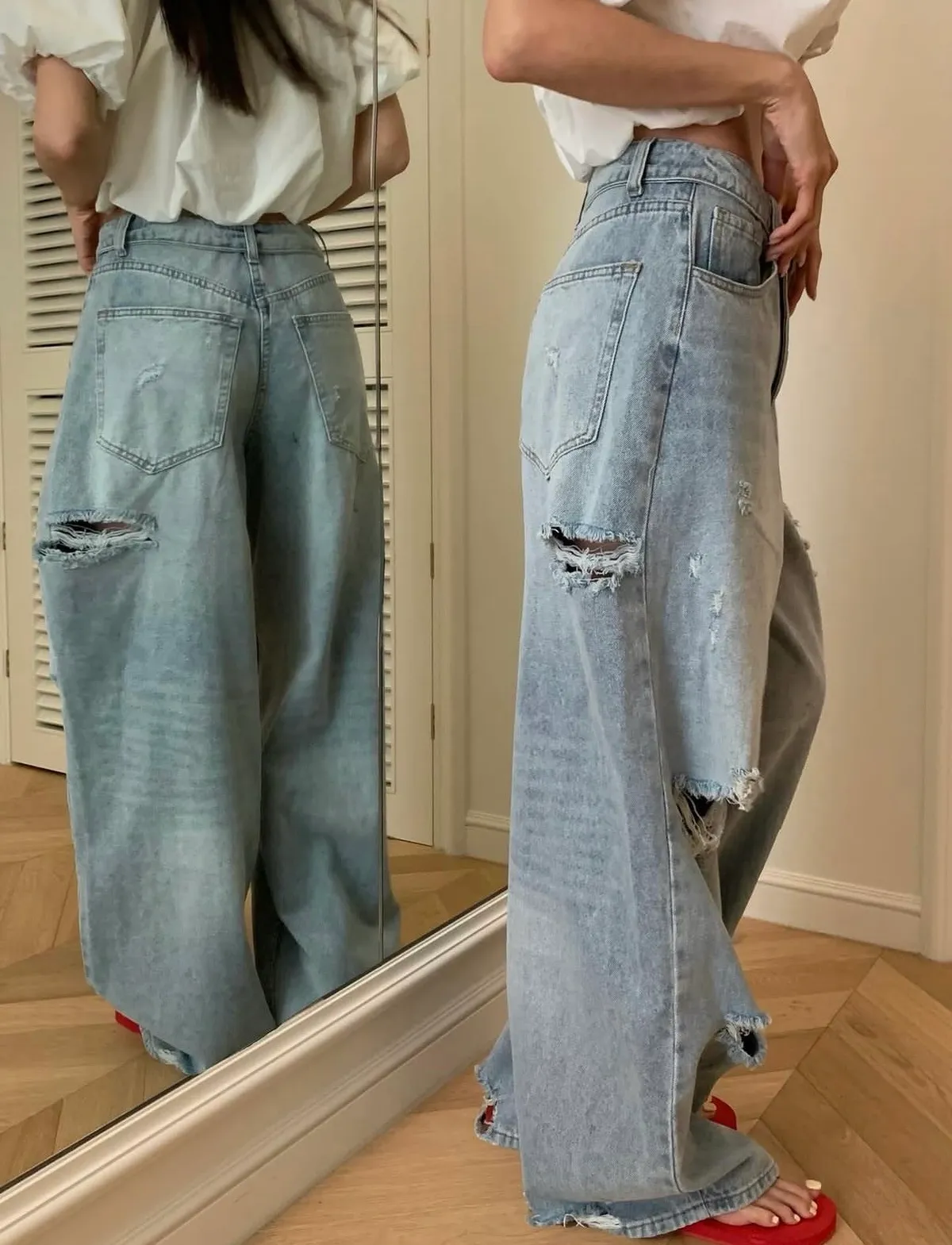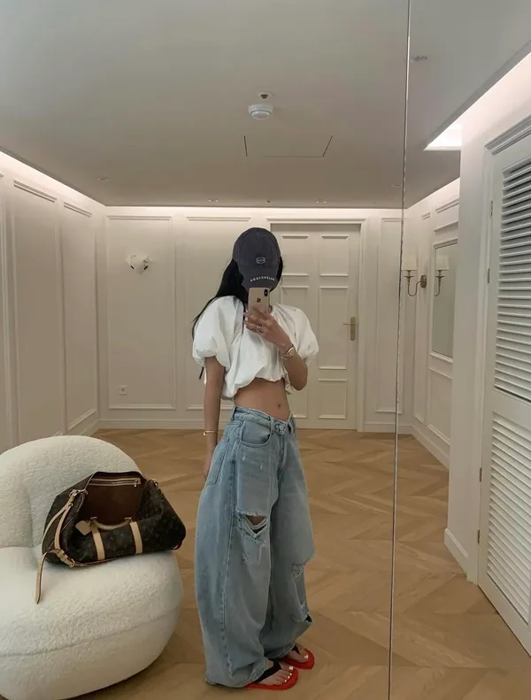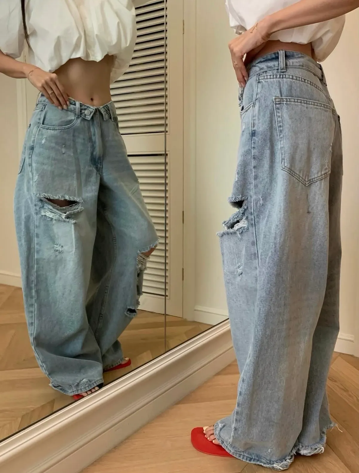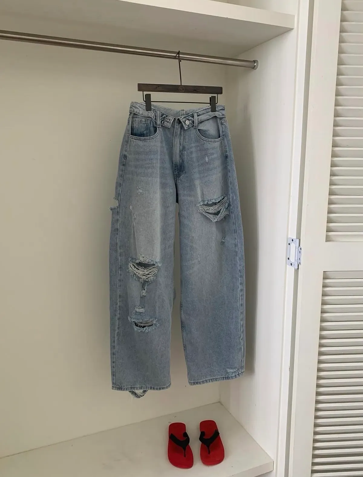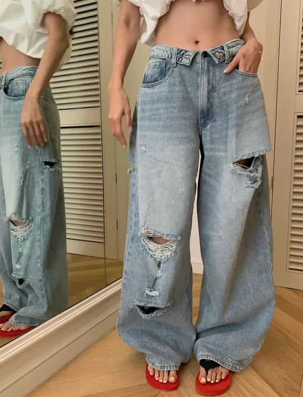 26EI44 破壞反摺扣腰頭牛仔長褲 SML