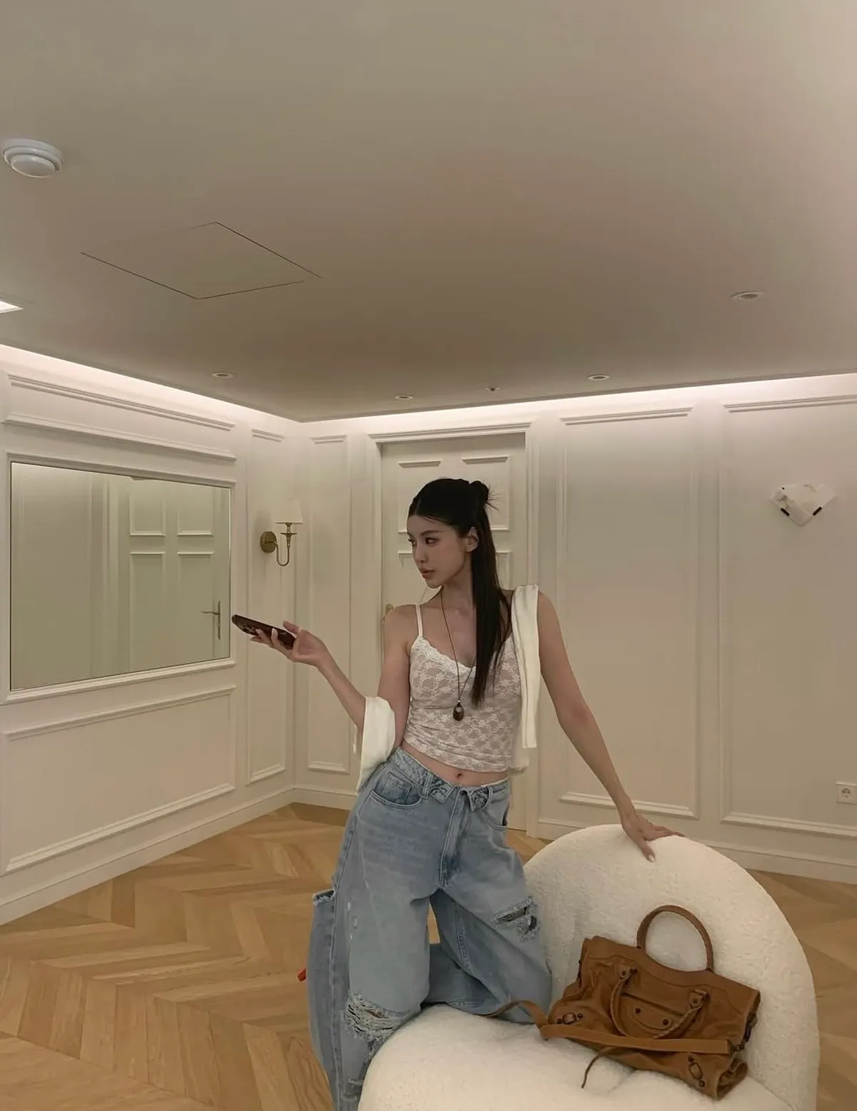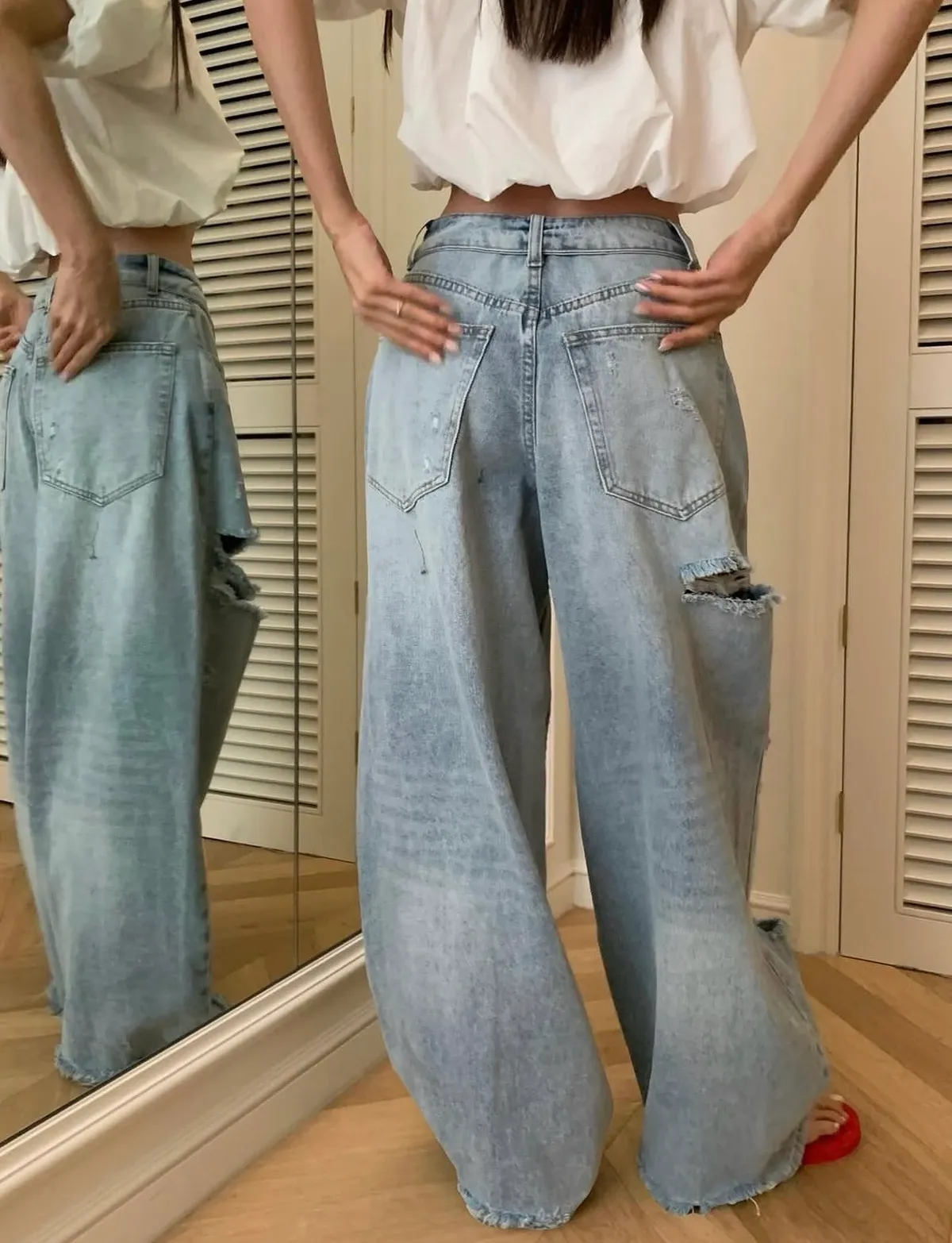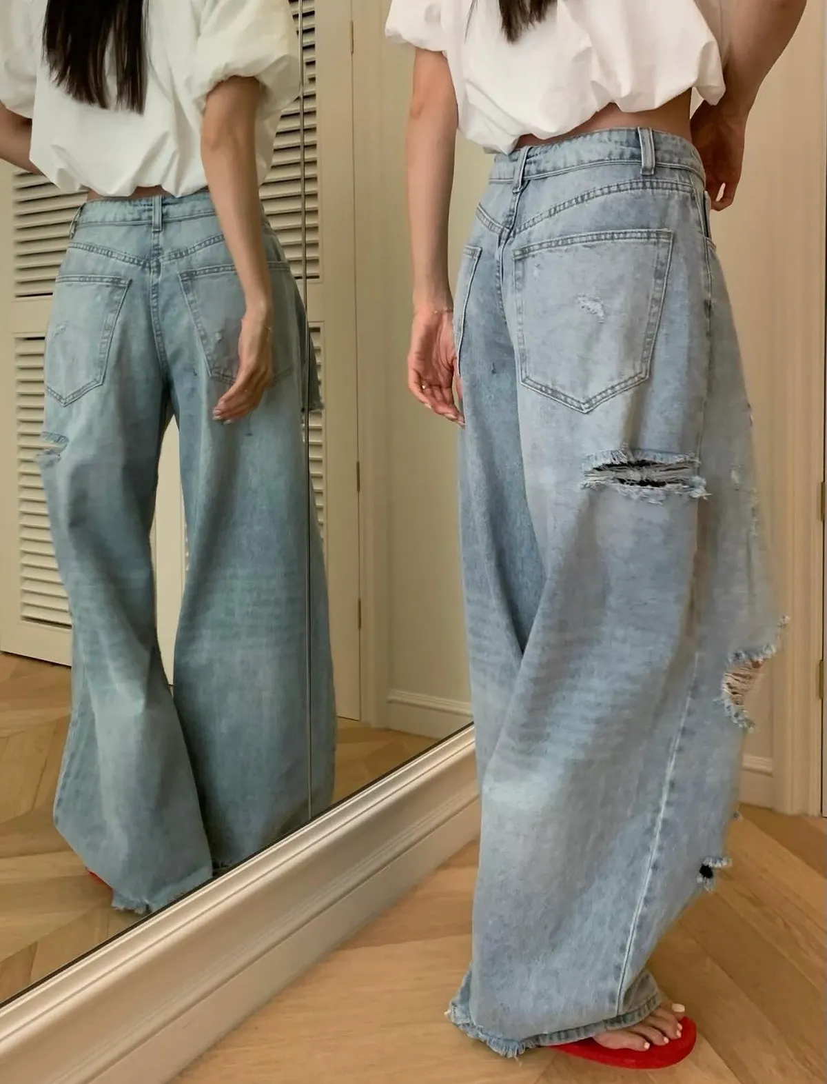 26EI44 破壞反摺扣腰頭牛仔長褲 SML