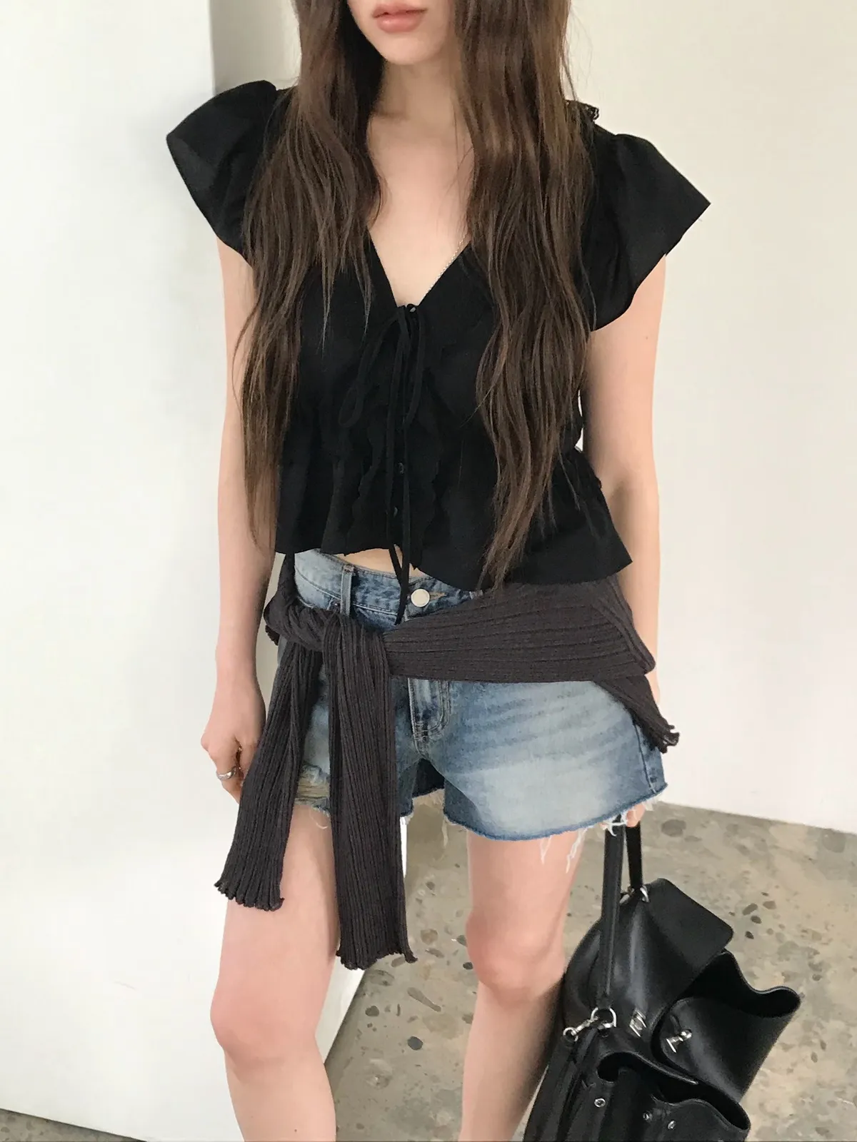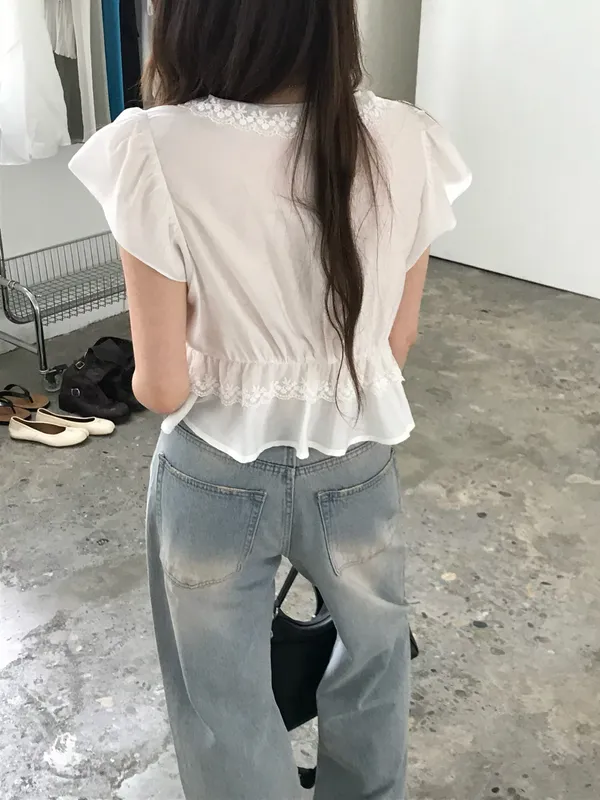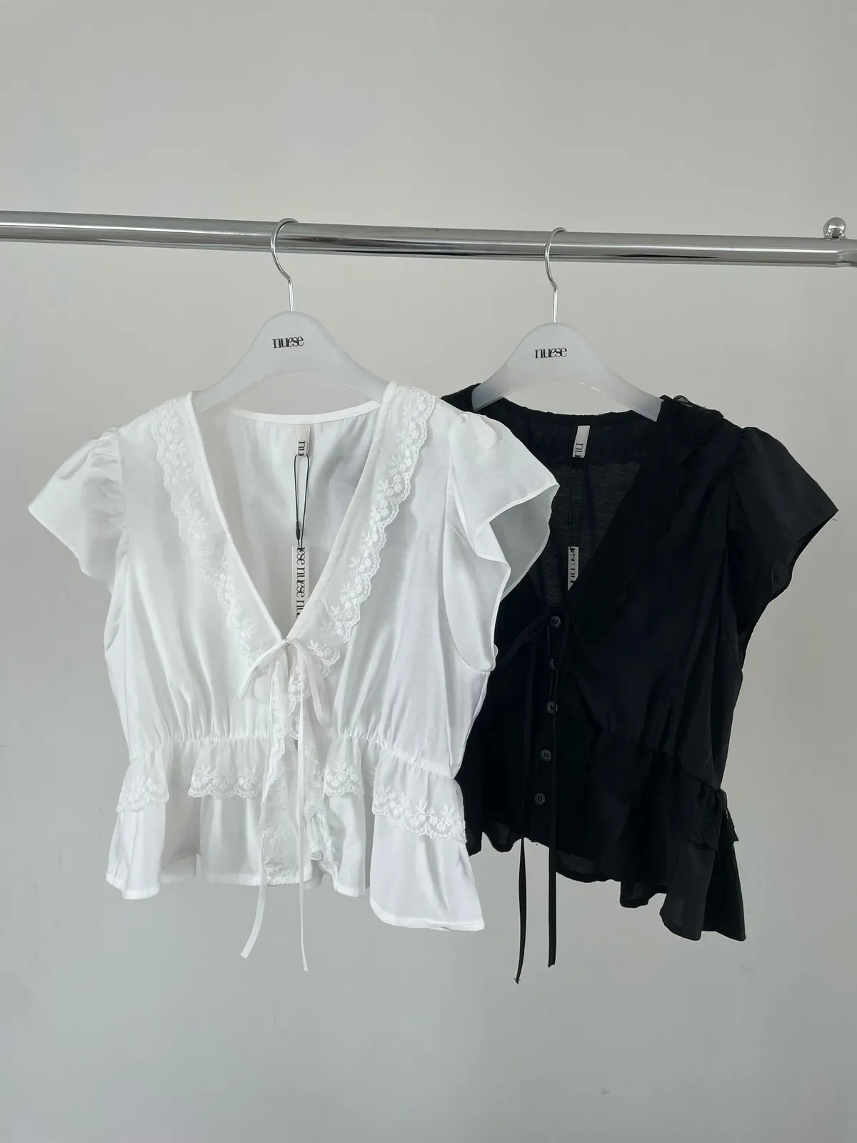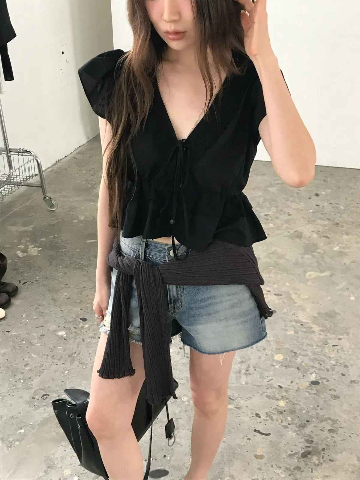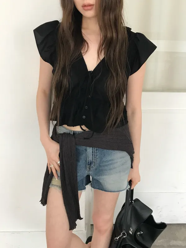 26EJ03 大開V領荷葉小袖排扣上衣 2色