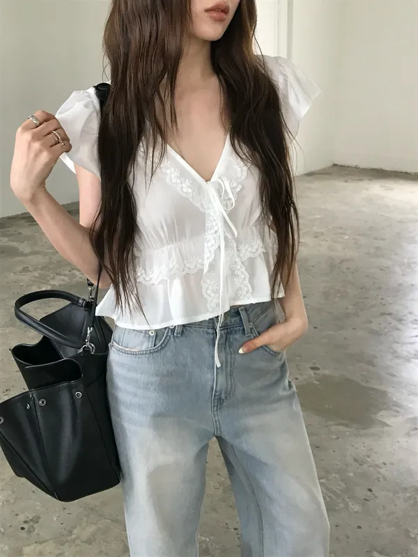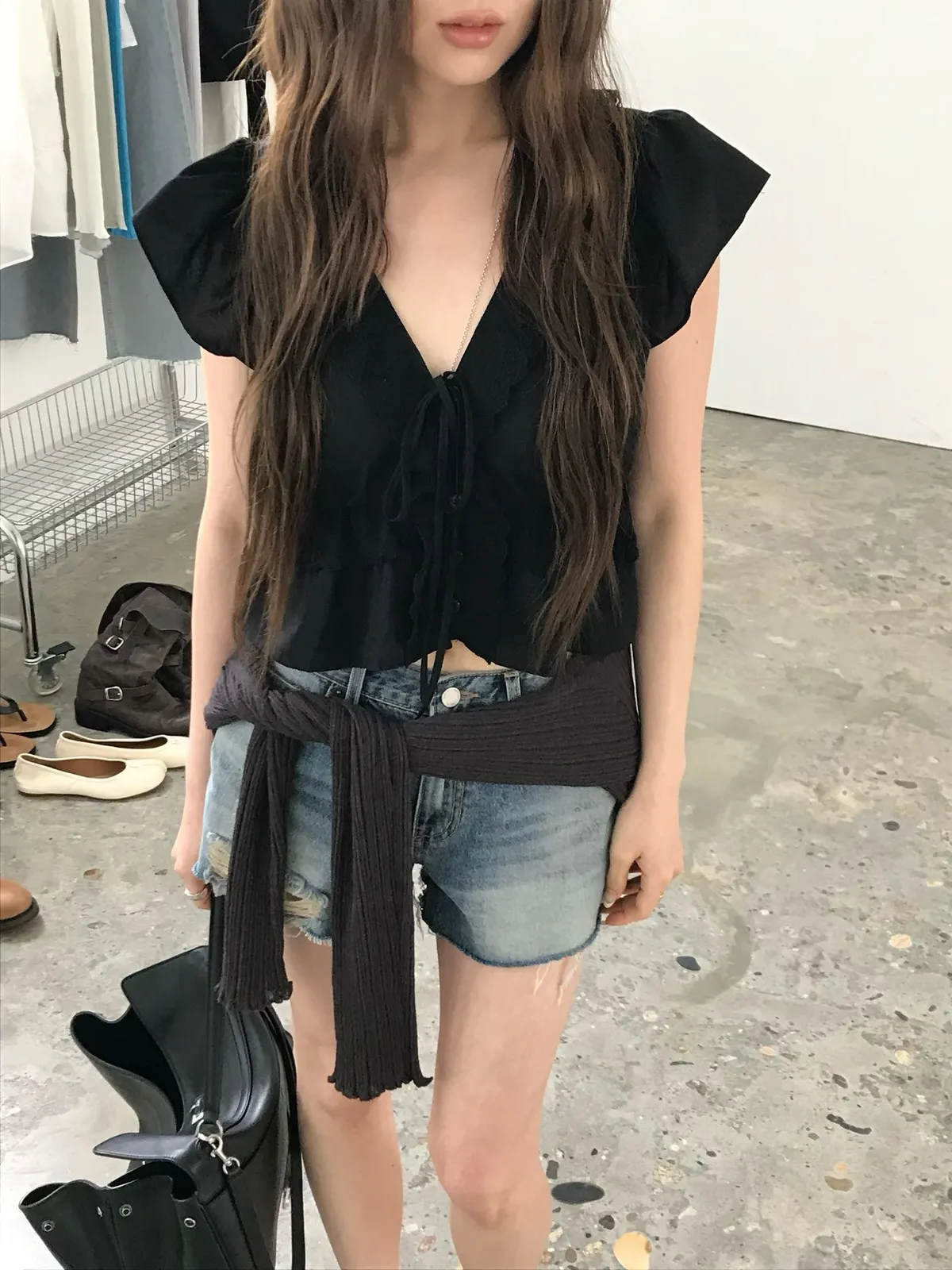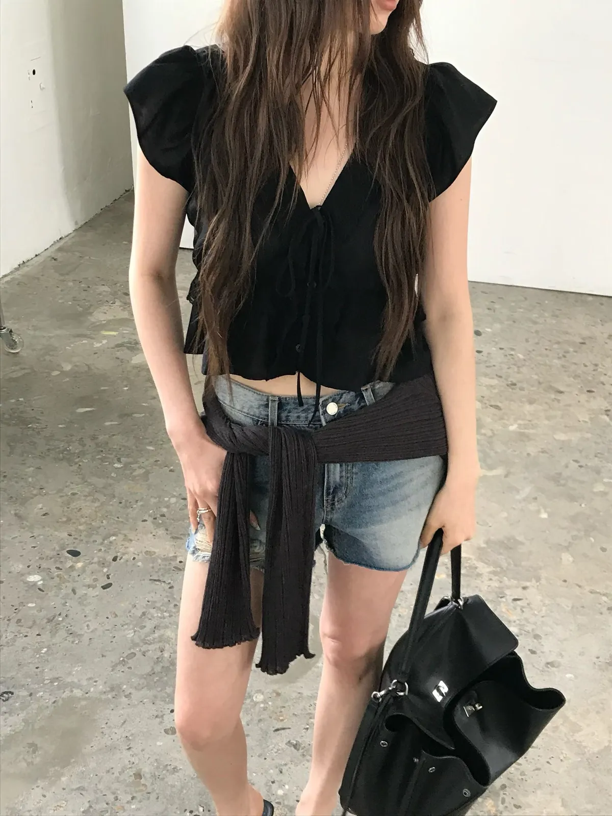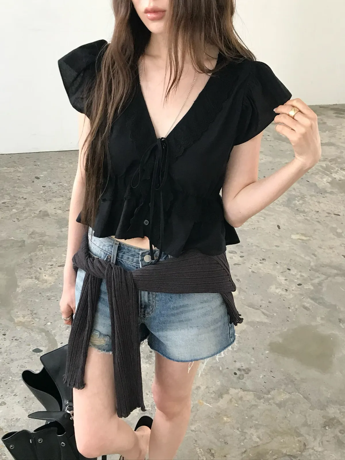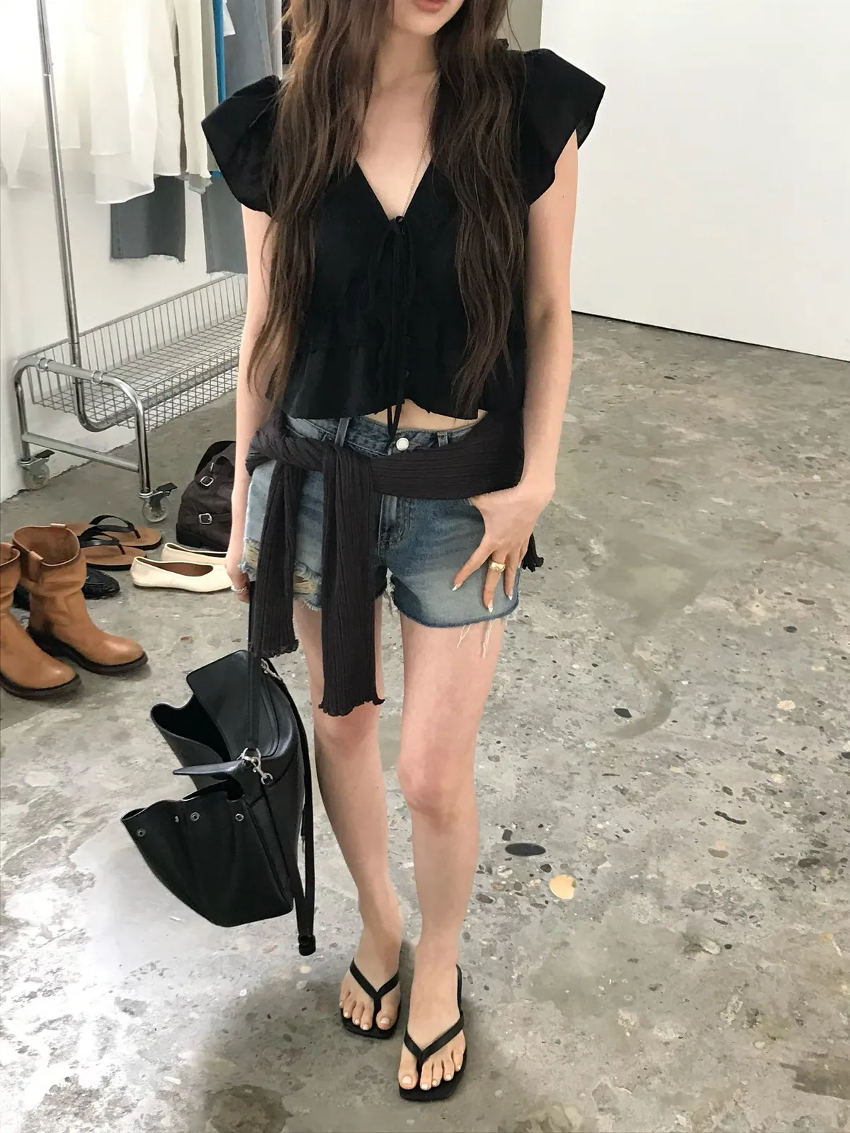 26EJ03 大開V領荷葉小袖排扣上衣 2色
