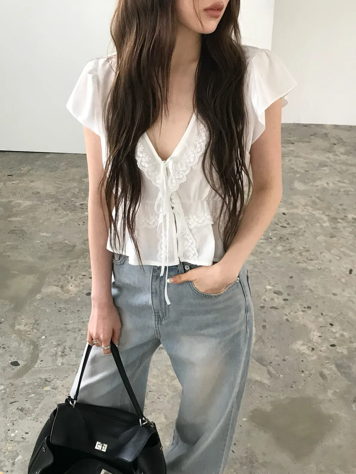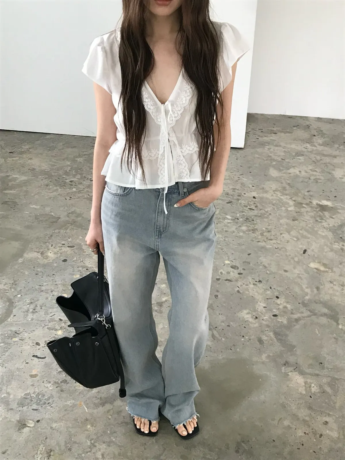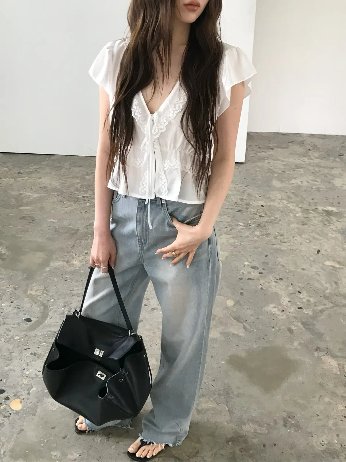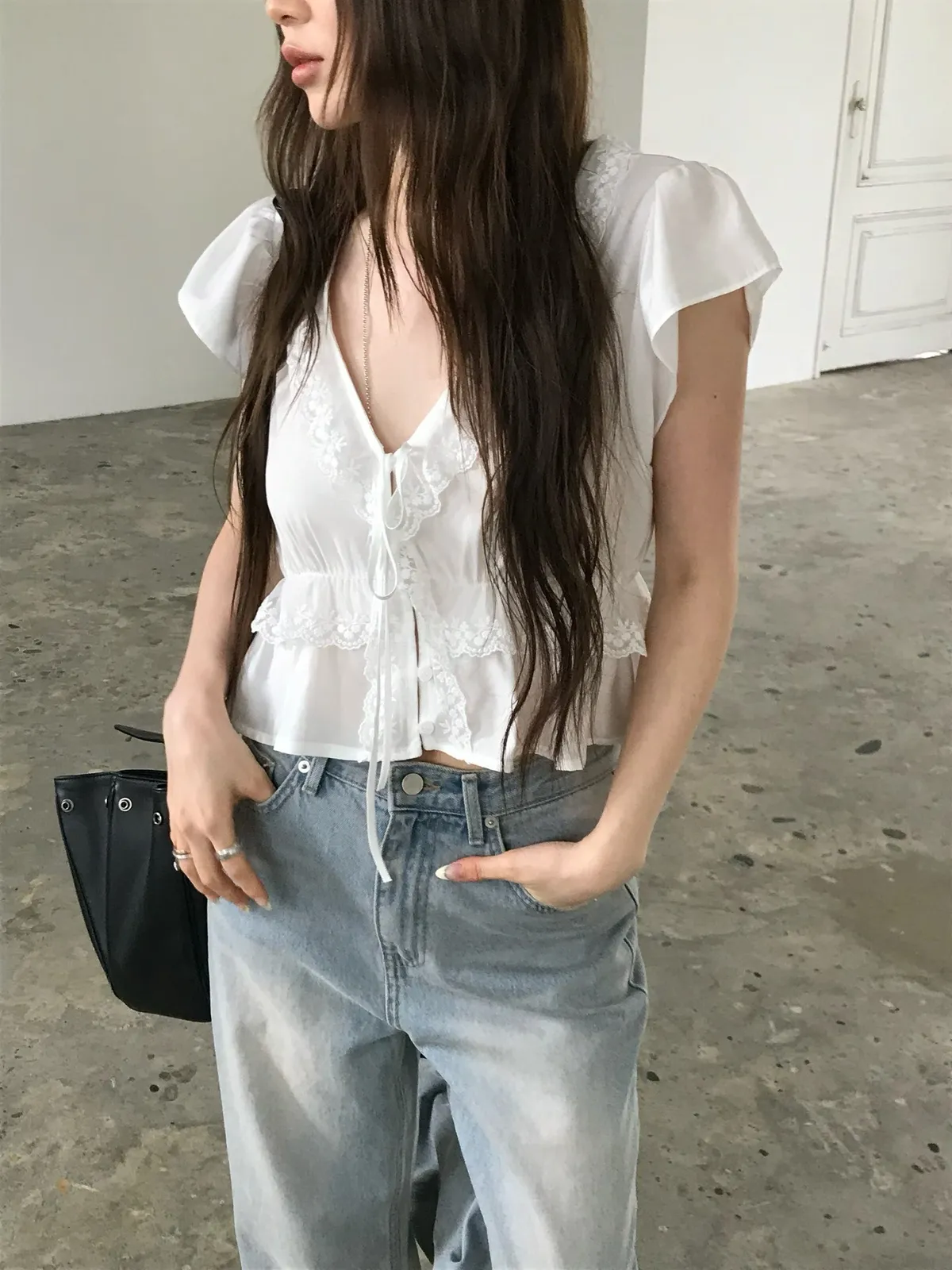 26EJ03 大開V領荷葉小袖排扣上衣 2色