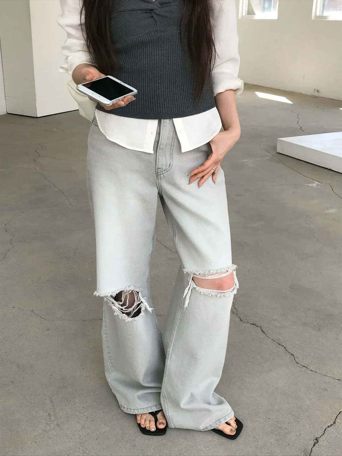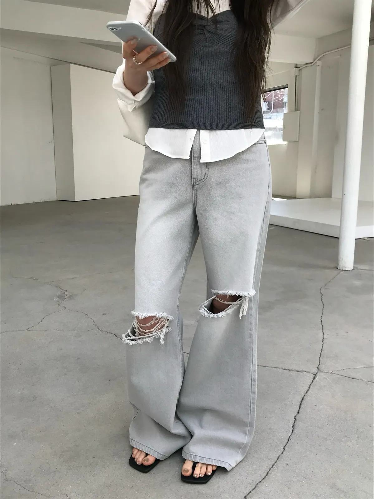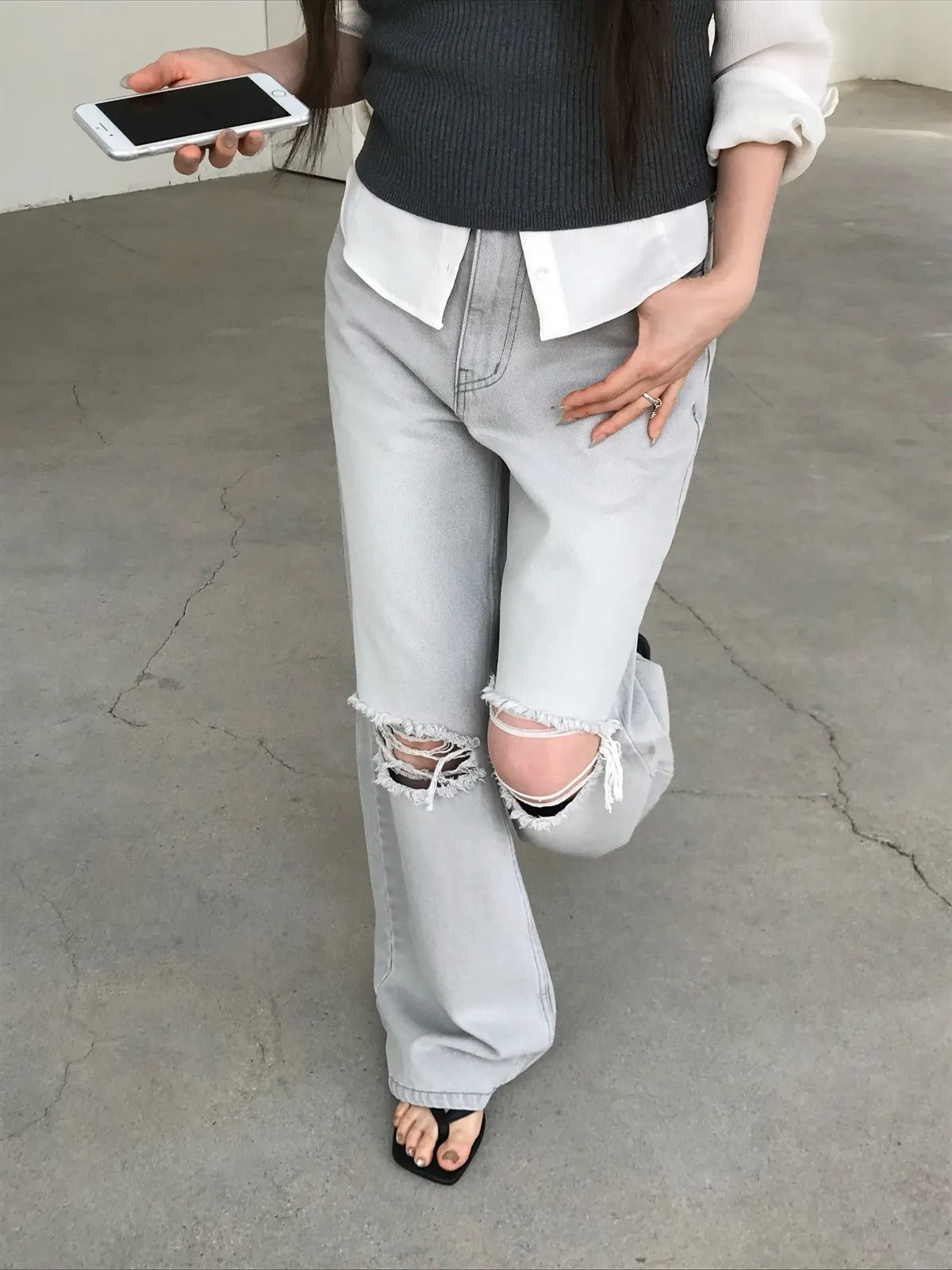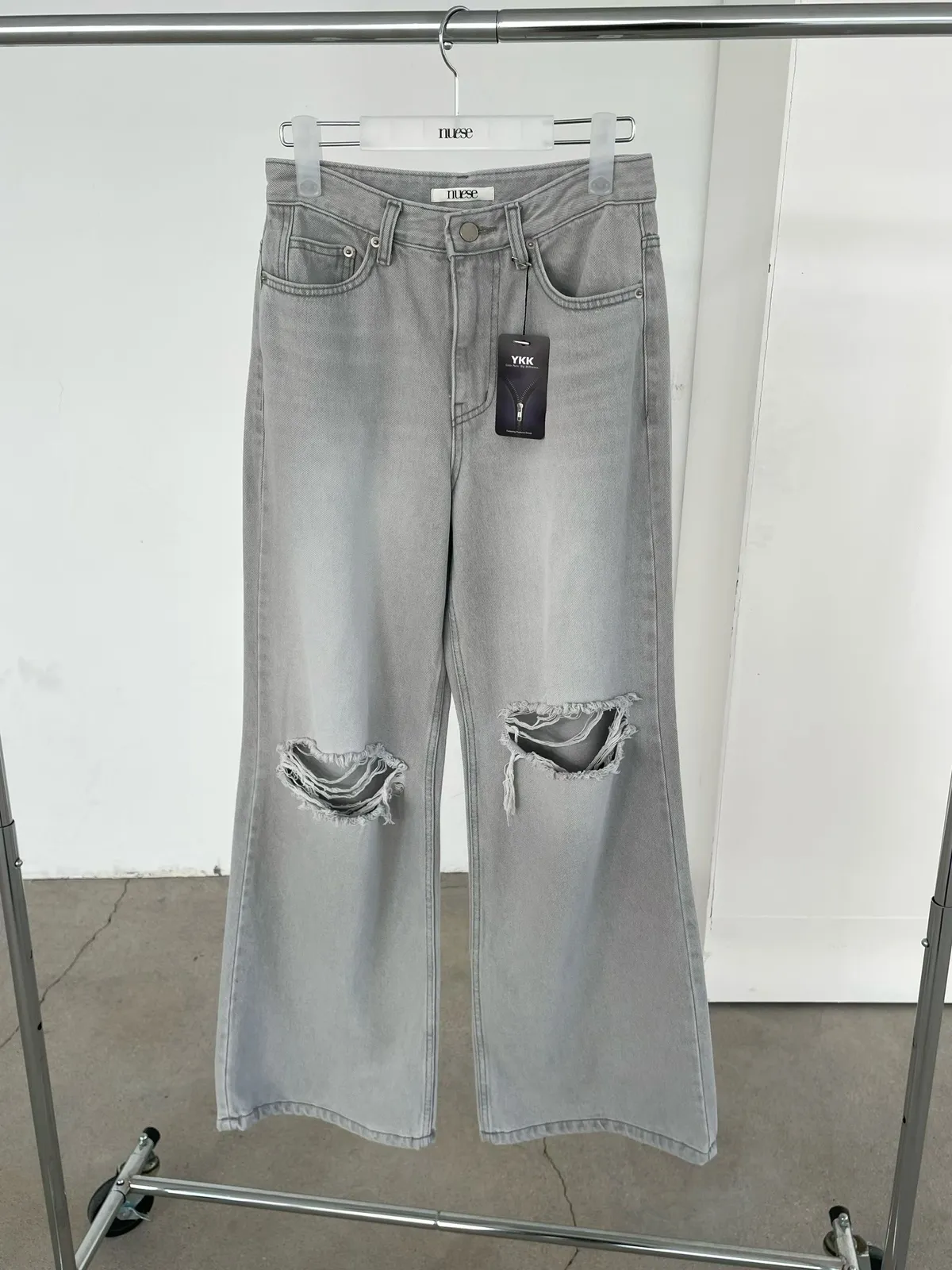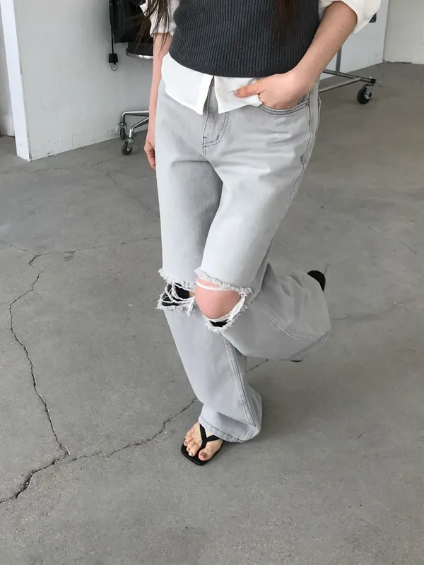 26EJ20 灰洗色破膝牛仔長褲 S