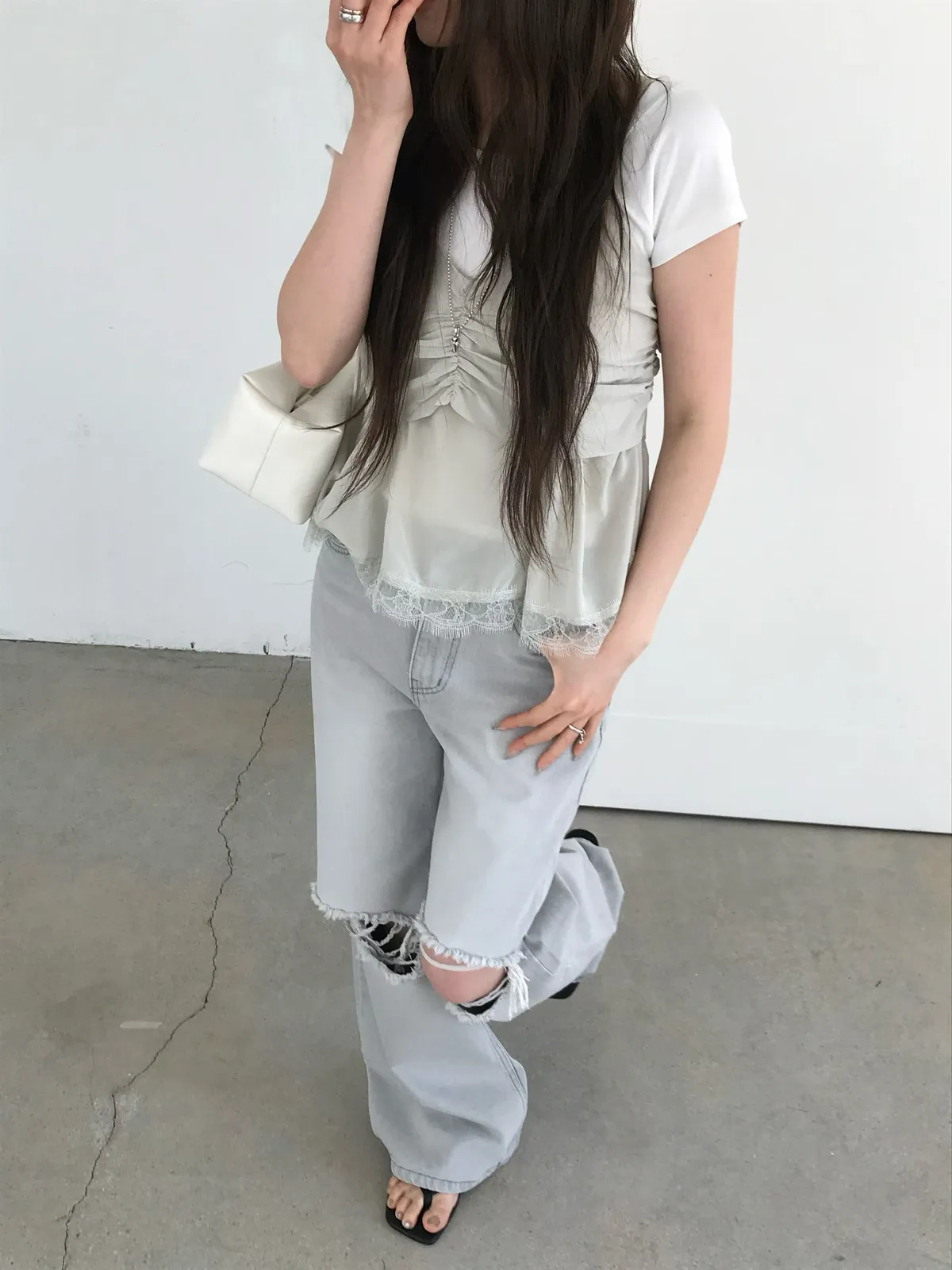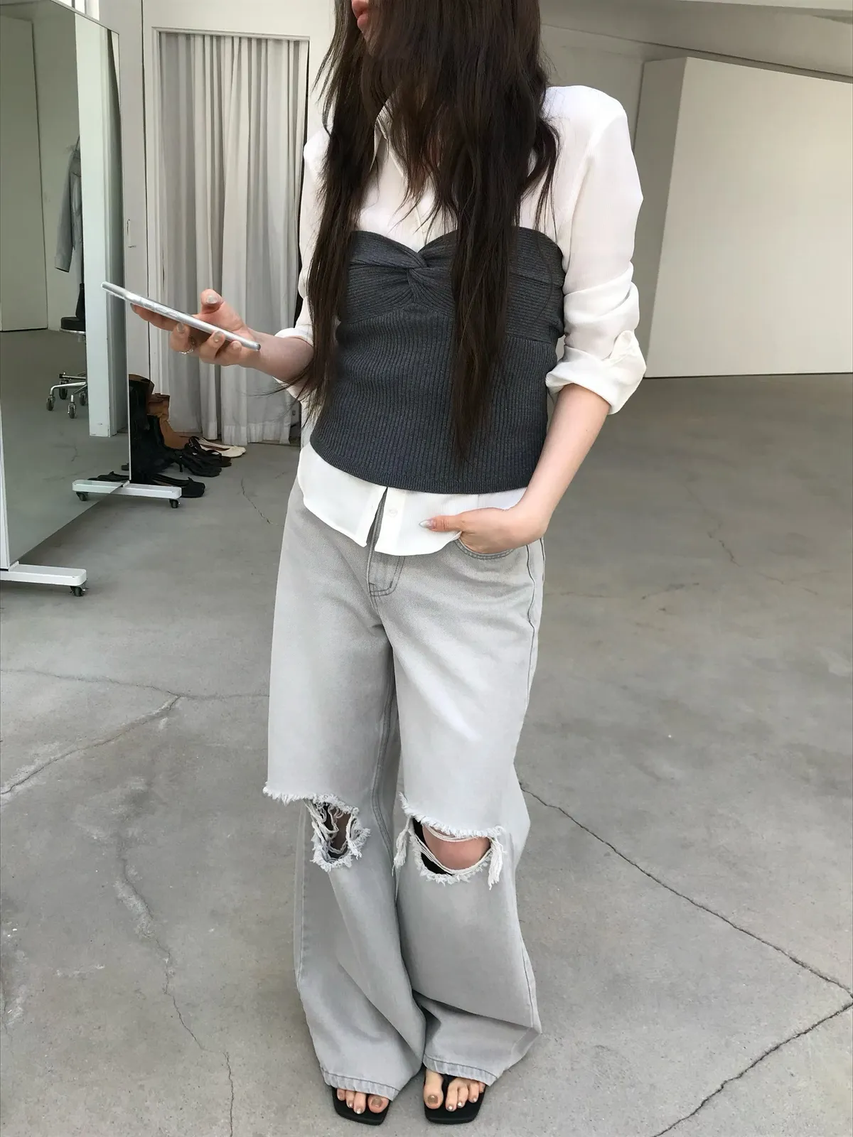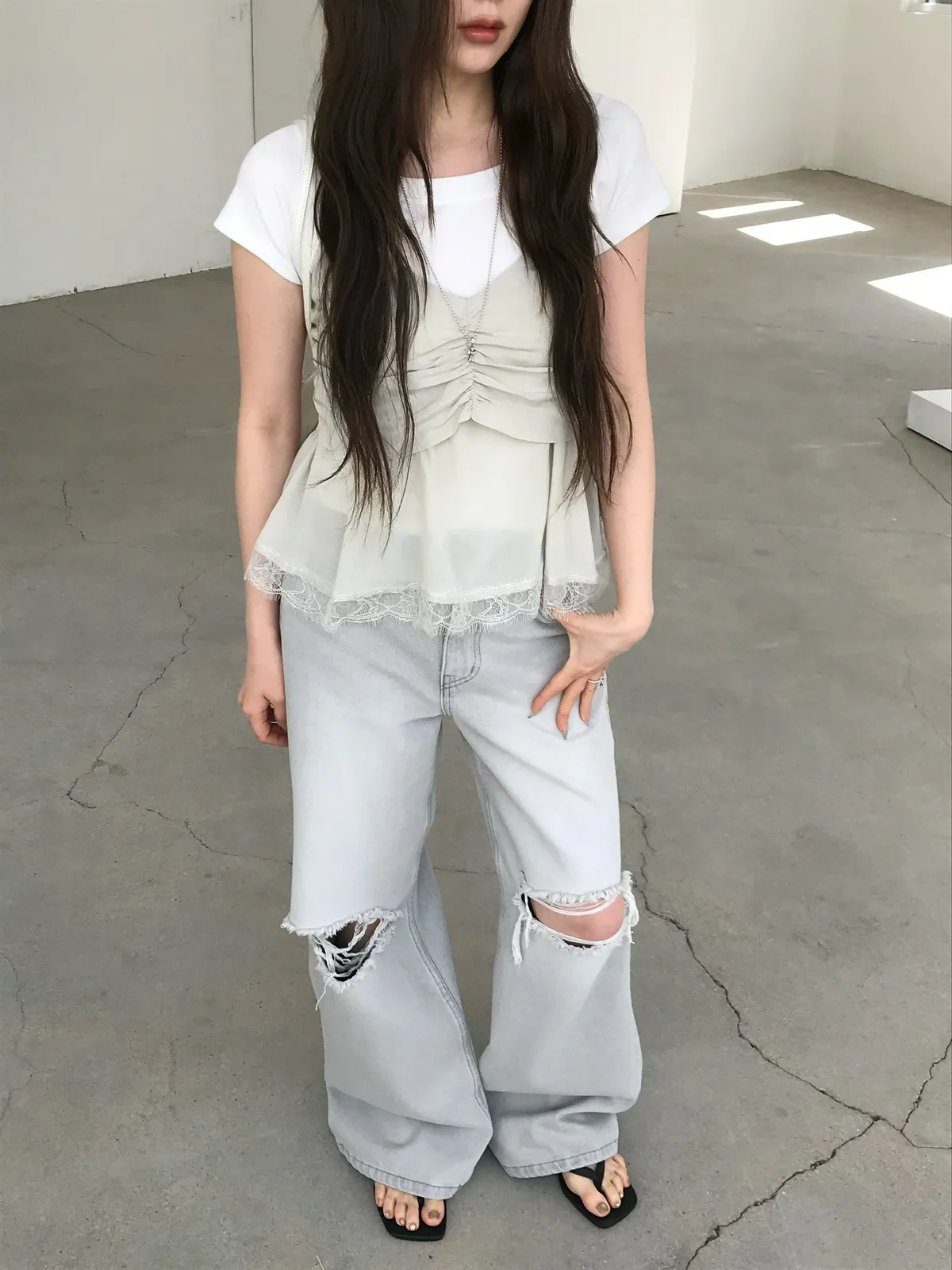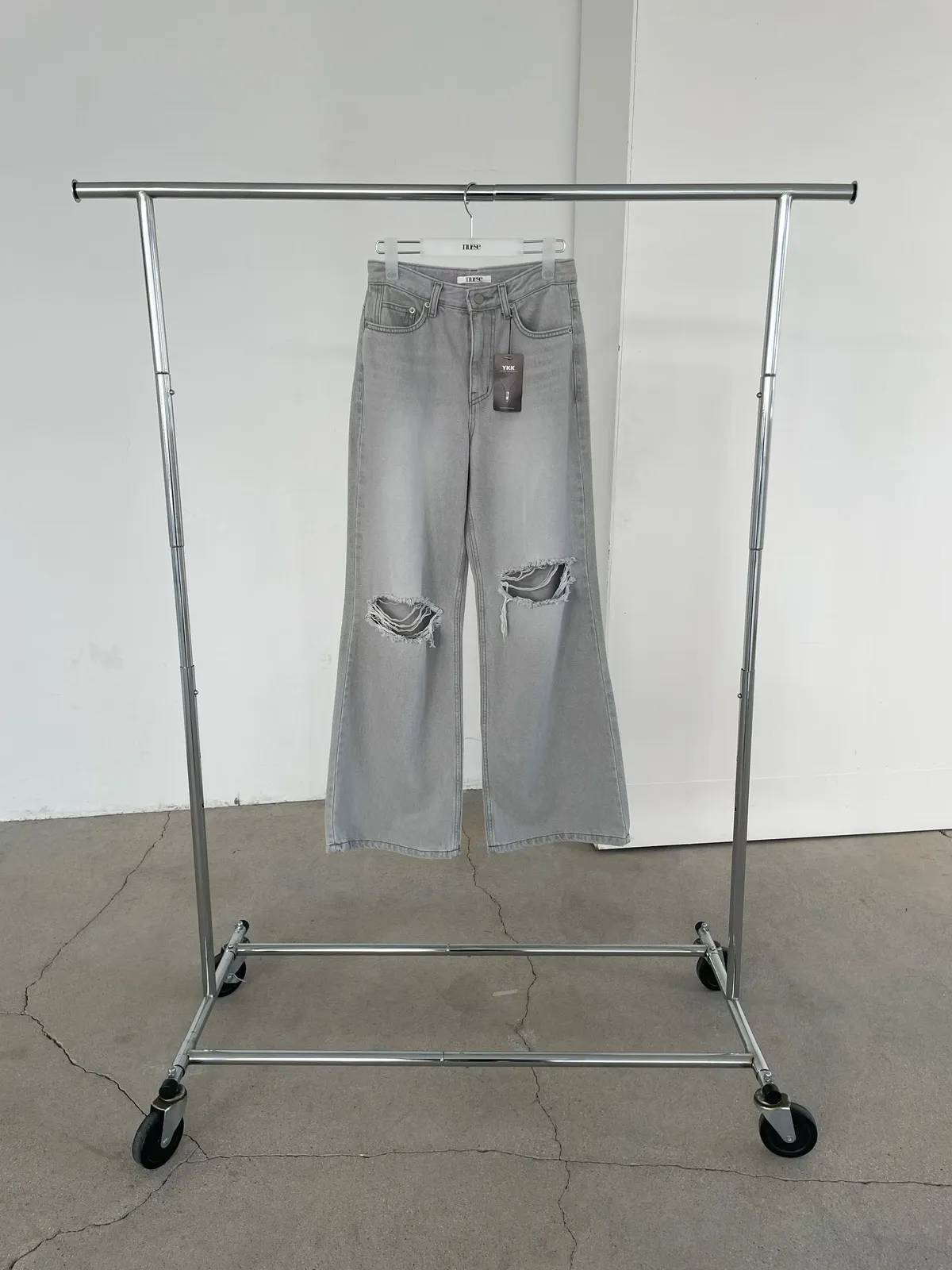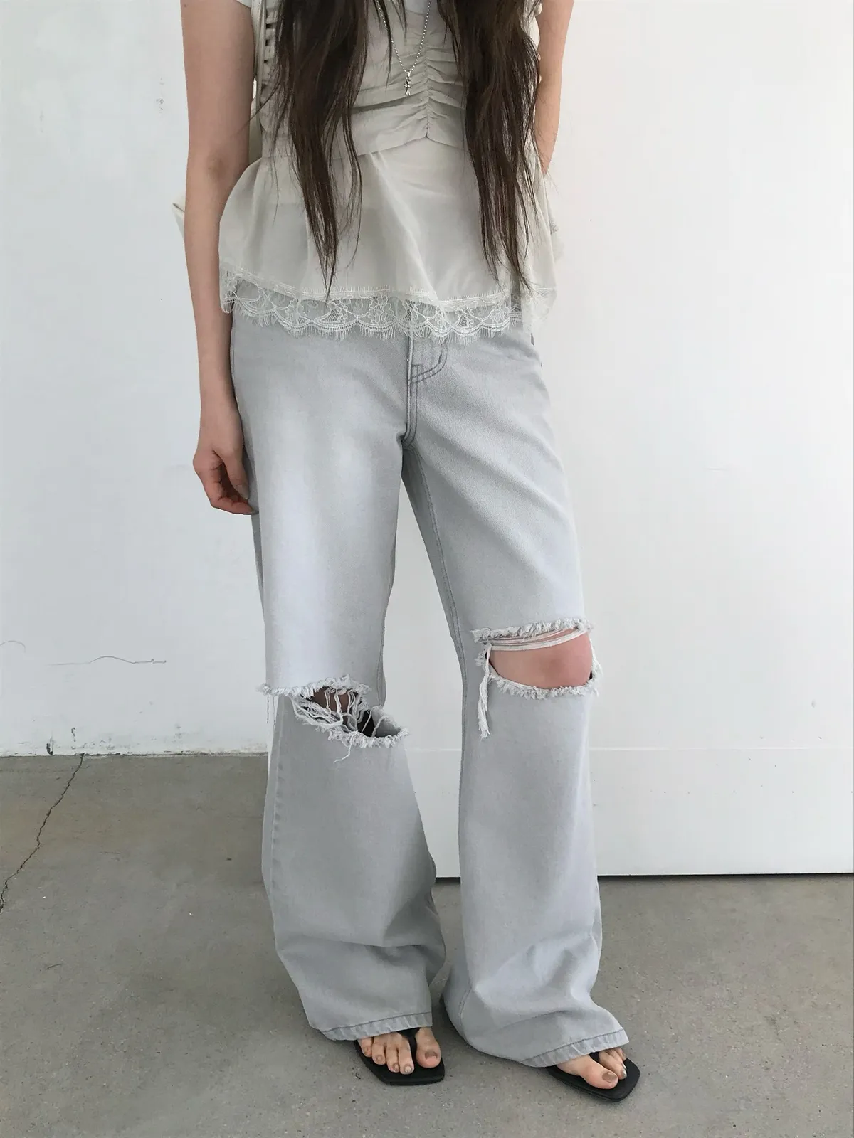 26EJ20 灰洗色破膝牛仔長褲 S