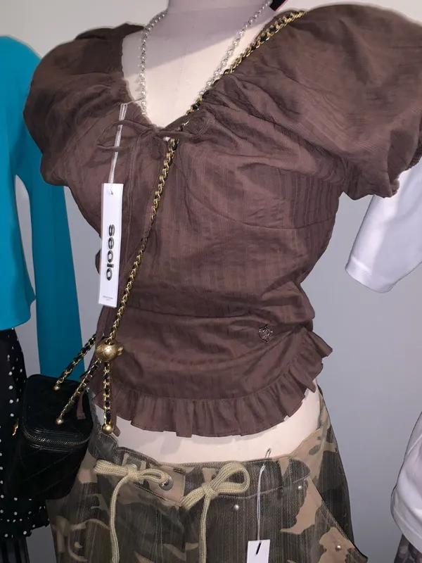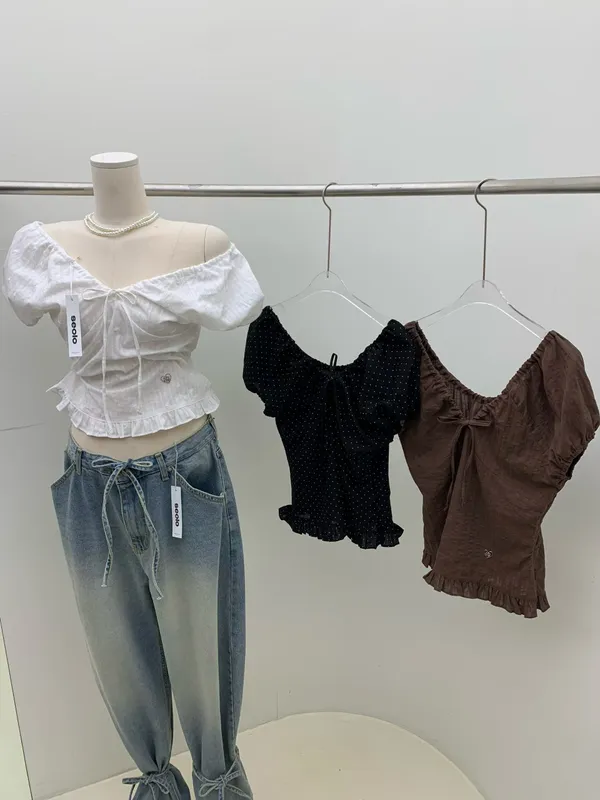 26ES12 V領綁帶收腰布蕾上衣 3色