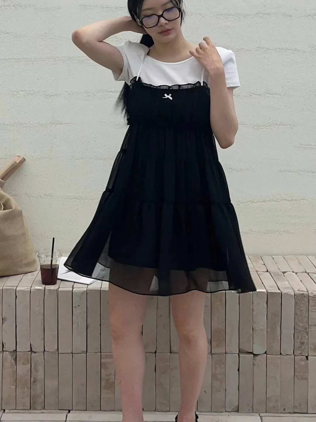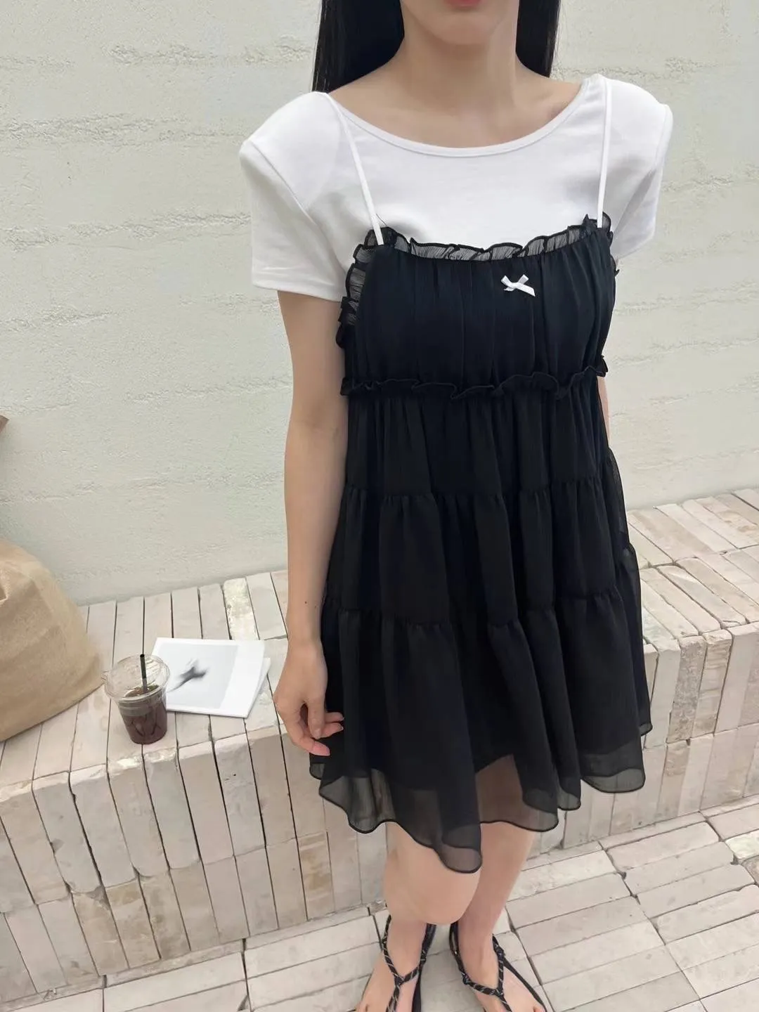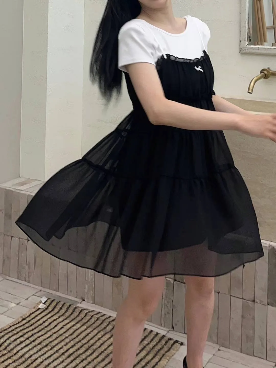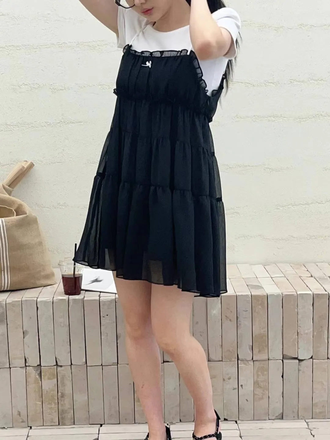 DD005 小清新緞帶小蝴蝶結三層紗質洋裝 3色
