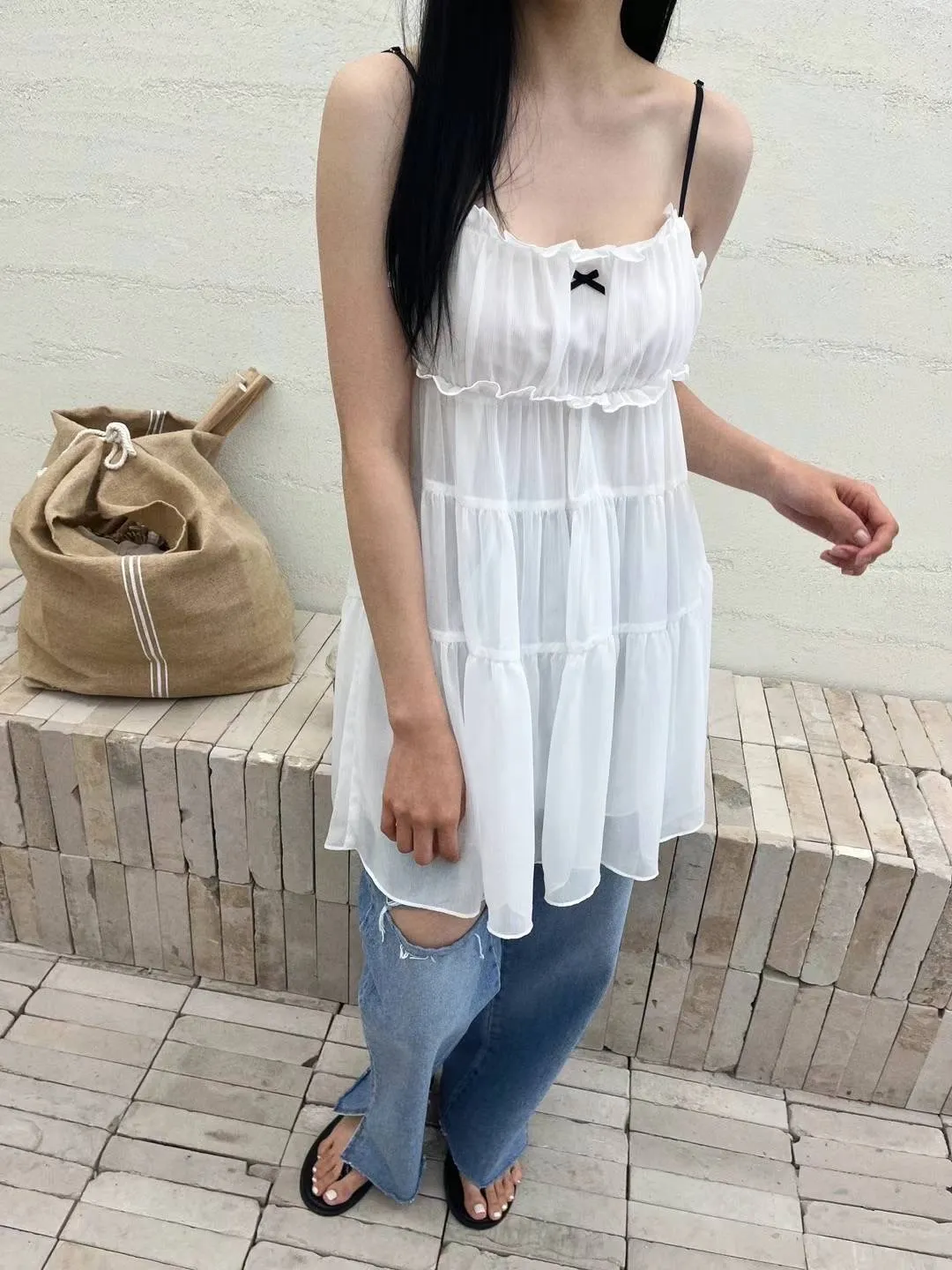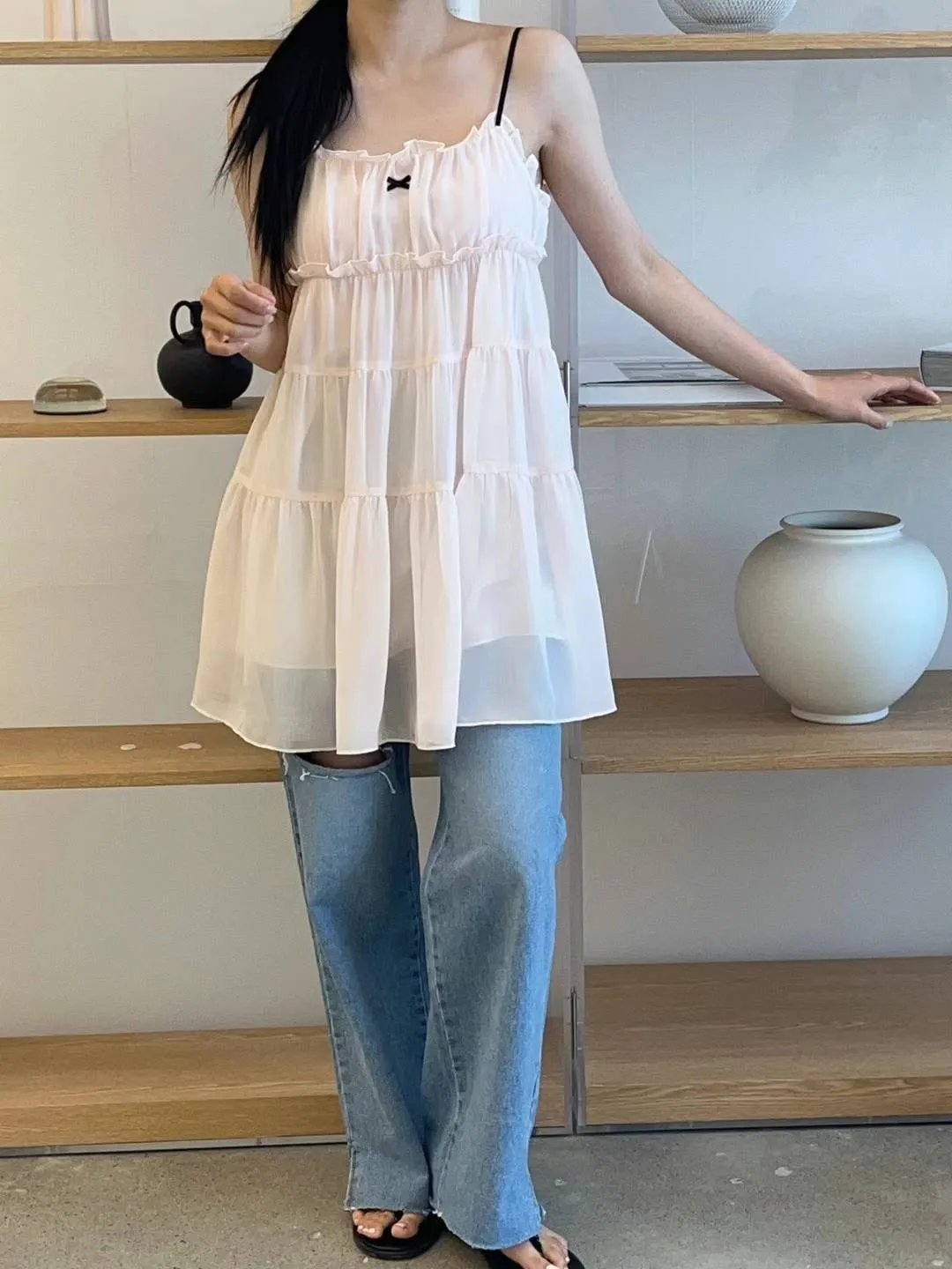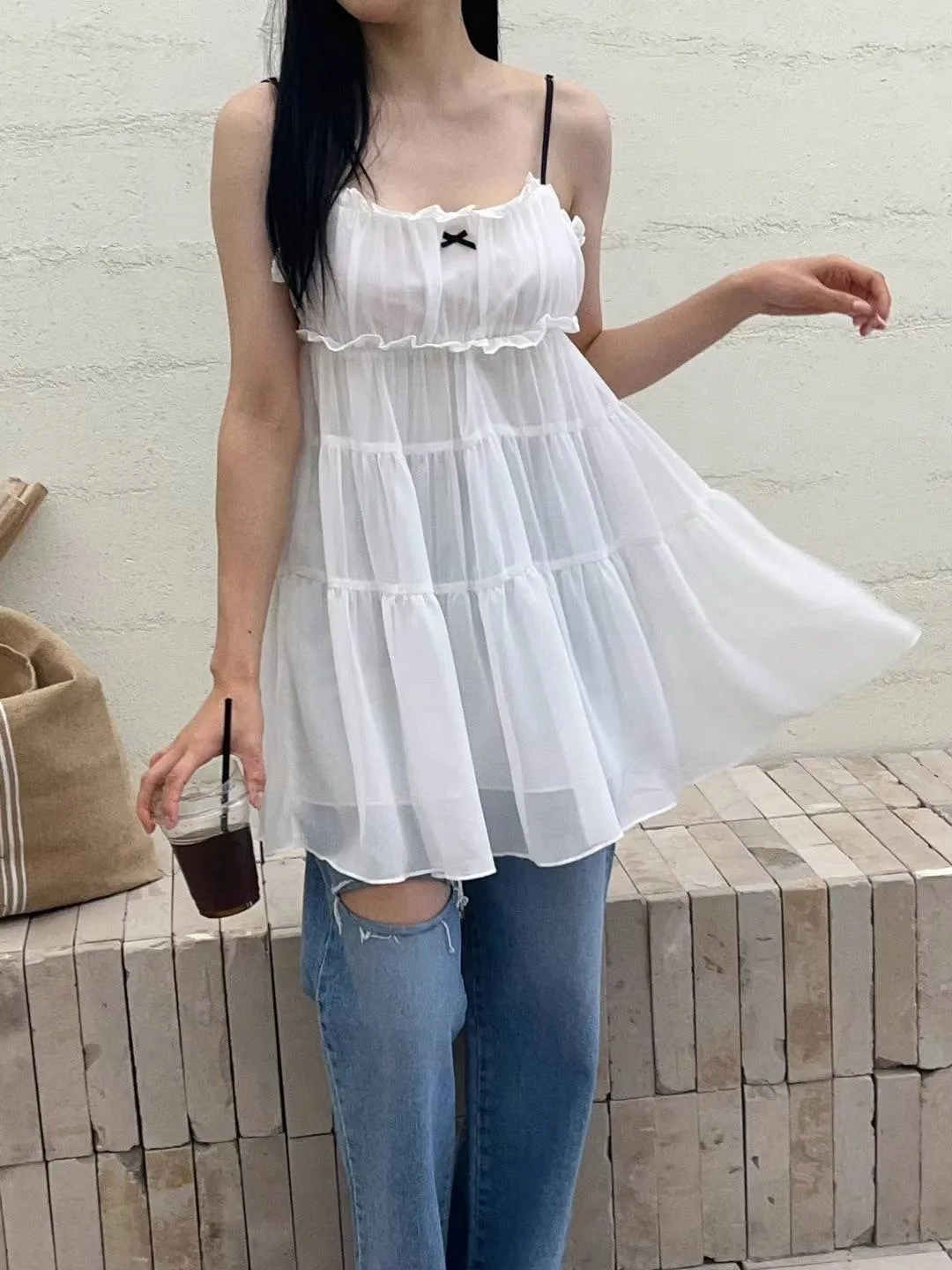 DD005 小清新緞帶小蝴蝶結三層紗質洋裝 3色