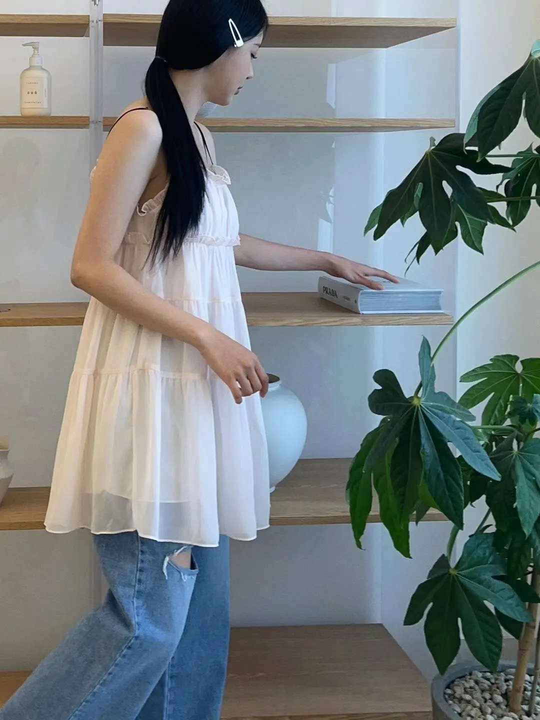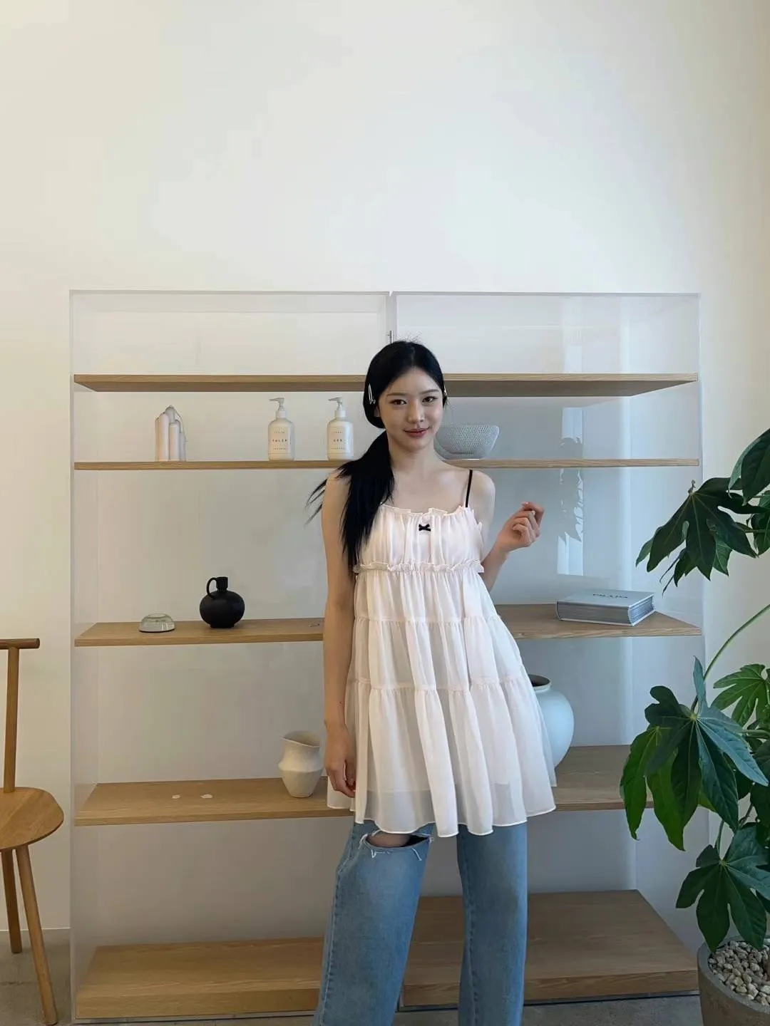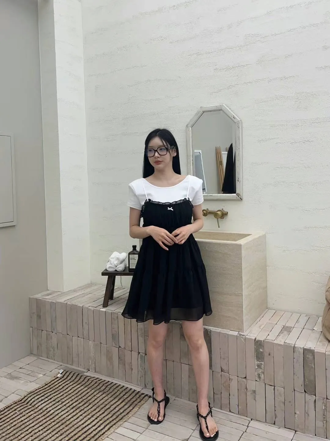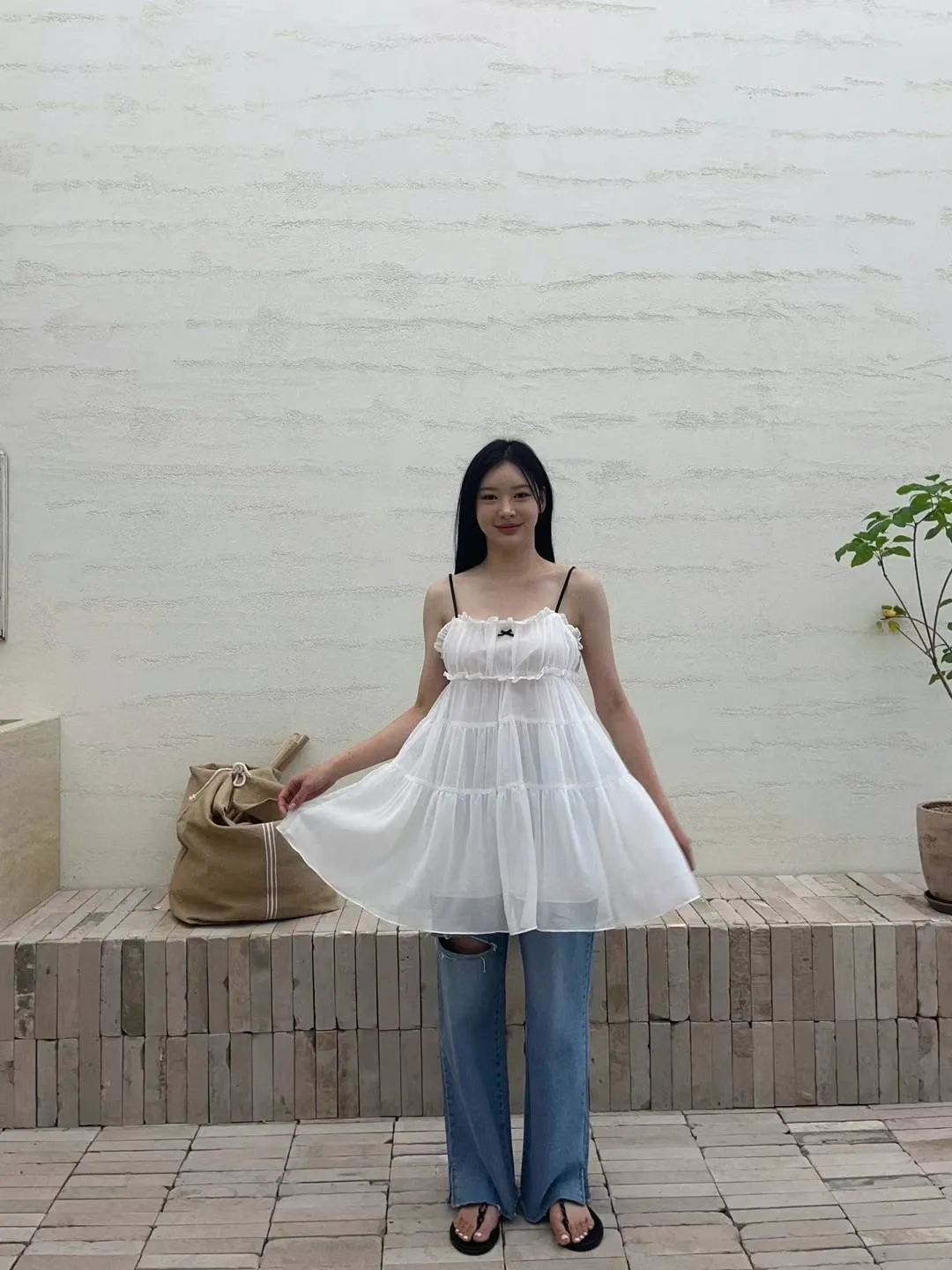 DD005 小清新緞帶小蝴蝶結三層紗質洋裝 3色