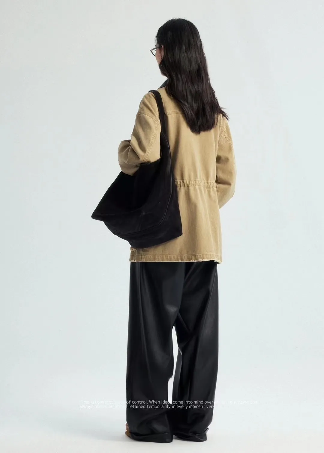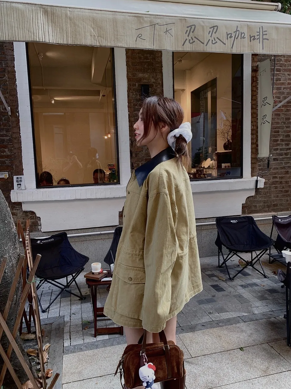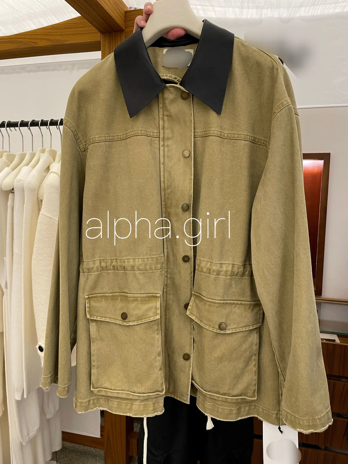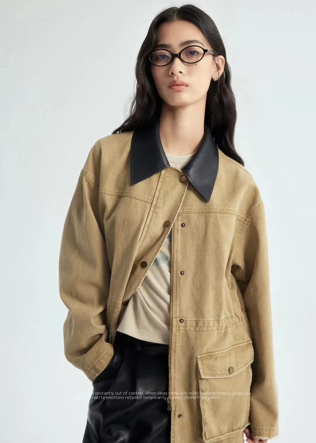 GIS03 廣州場)今年必買)洗色斜紋內縮腰拼接皮領中長版外套 SM