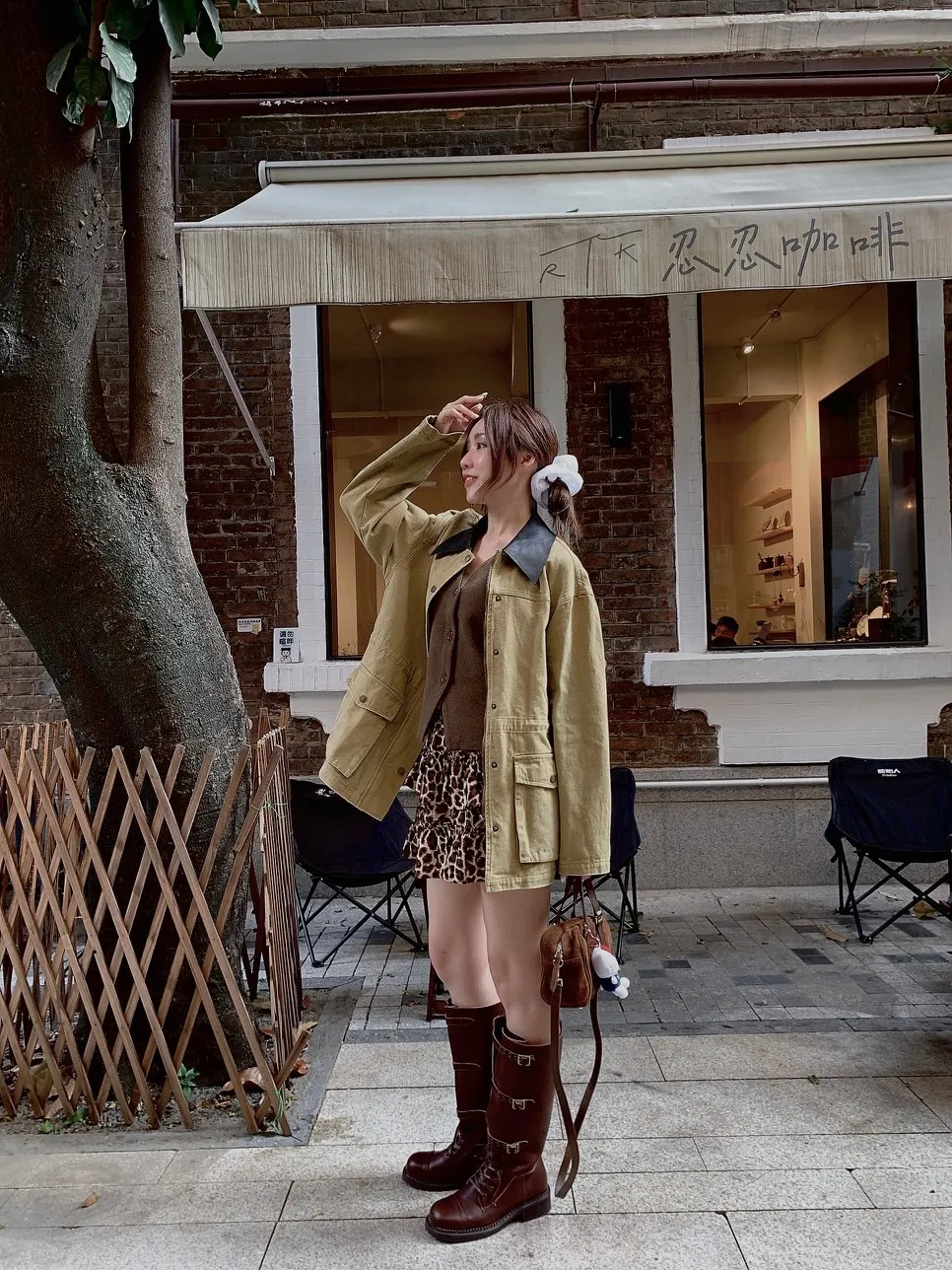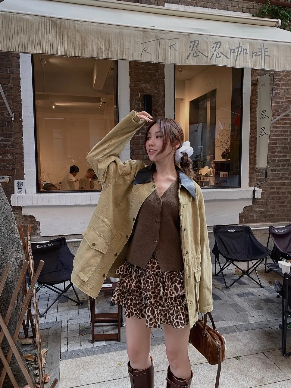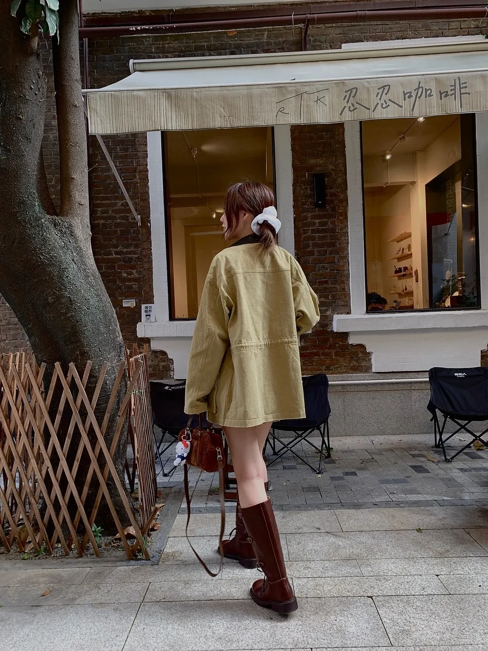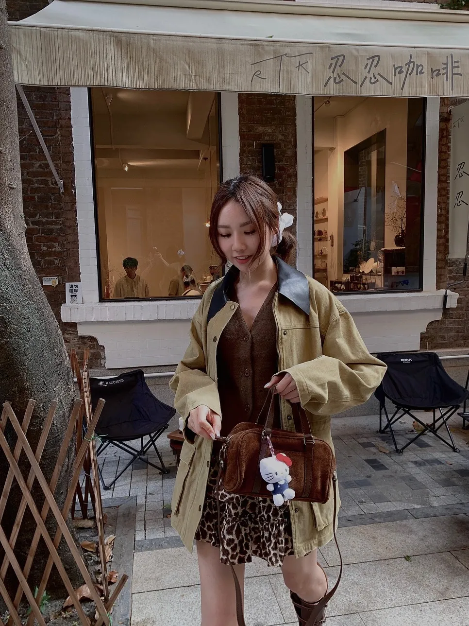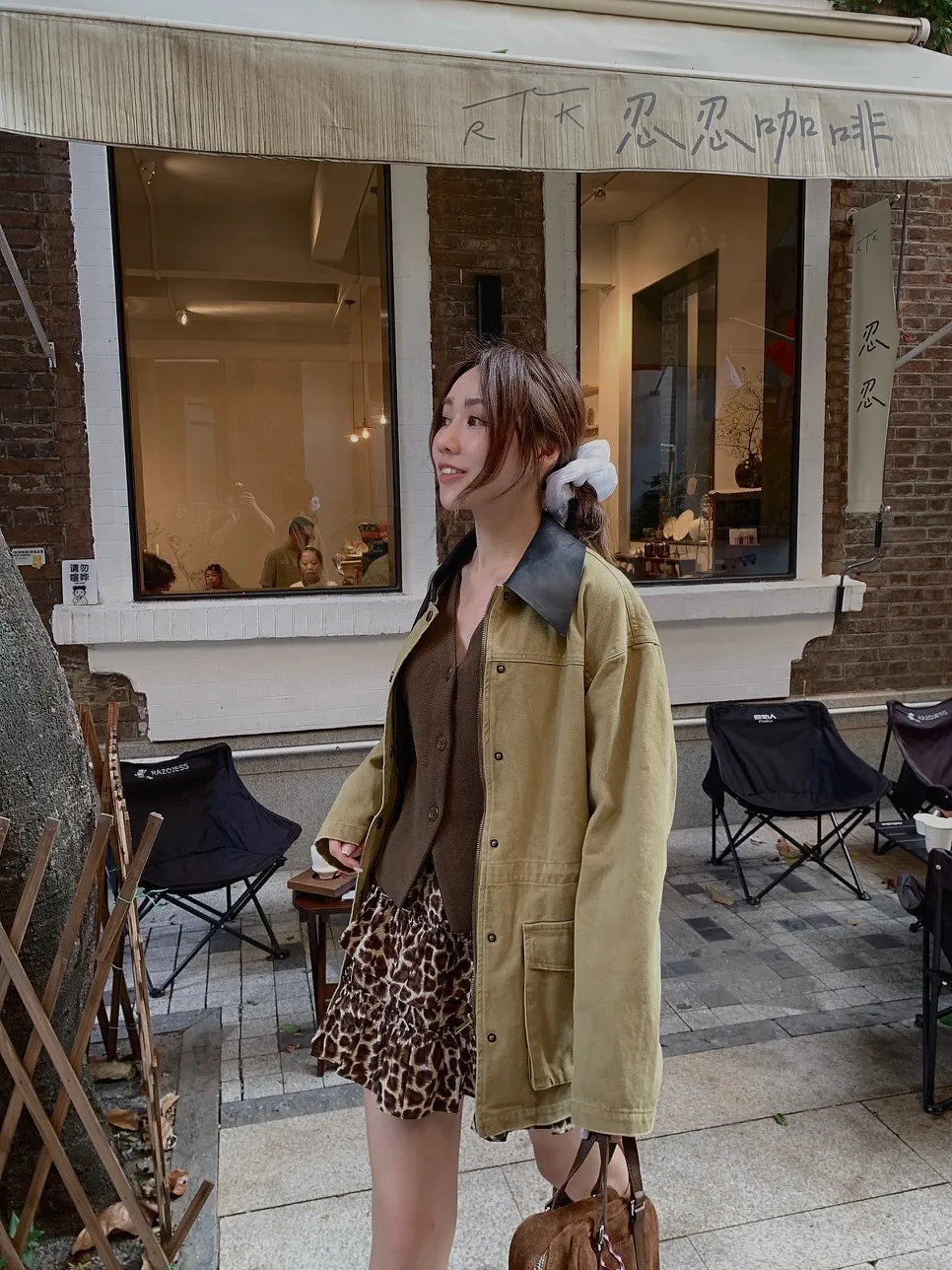 GIS03 廣州場)今年必買)洗色斜紋內縮腰拼接皮領中長版外套 SM