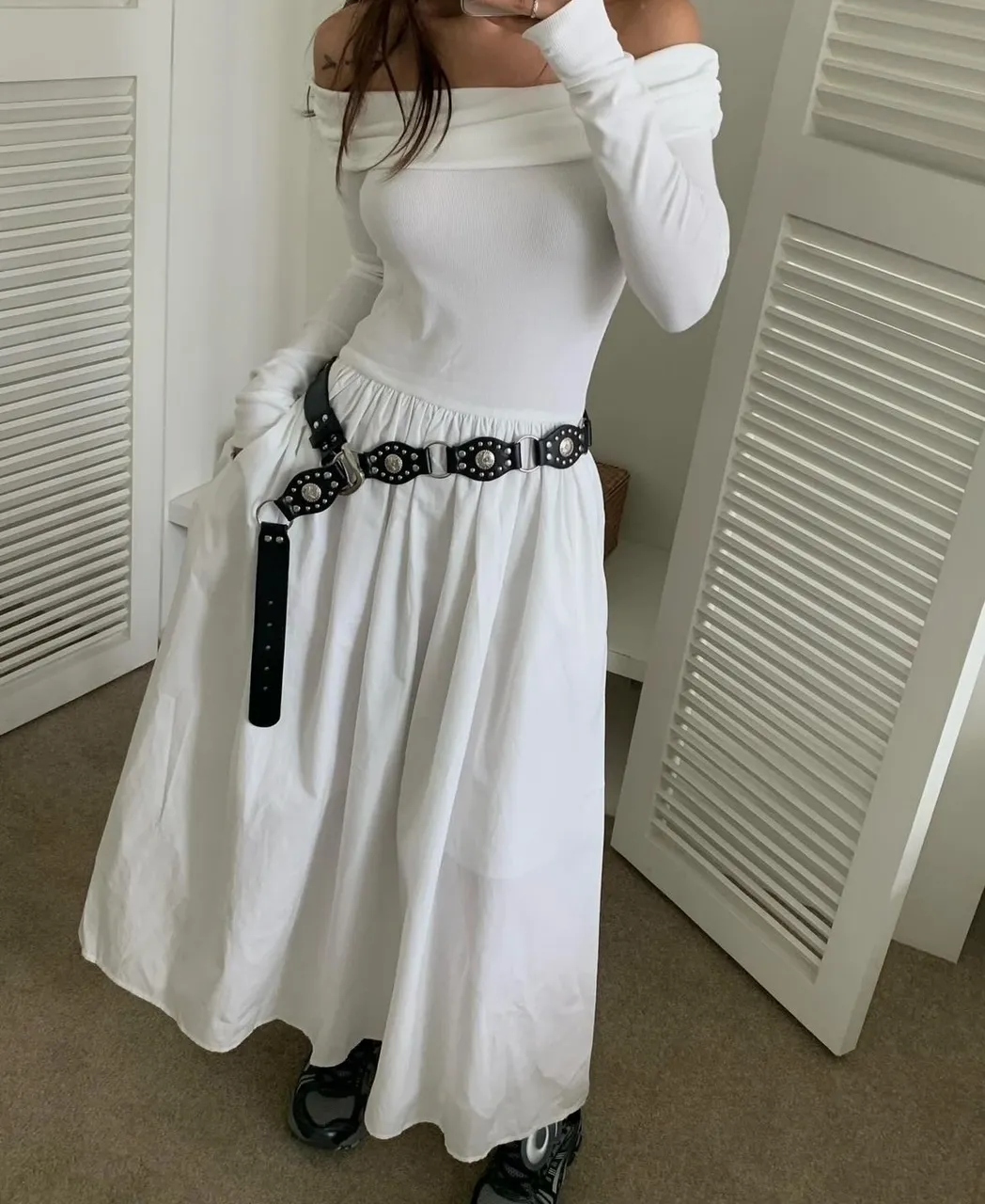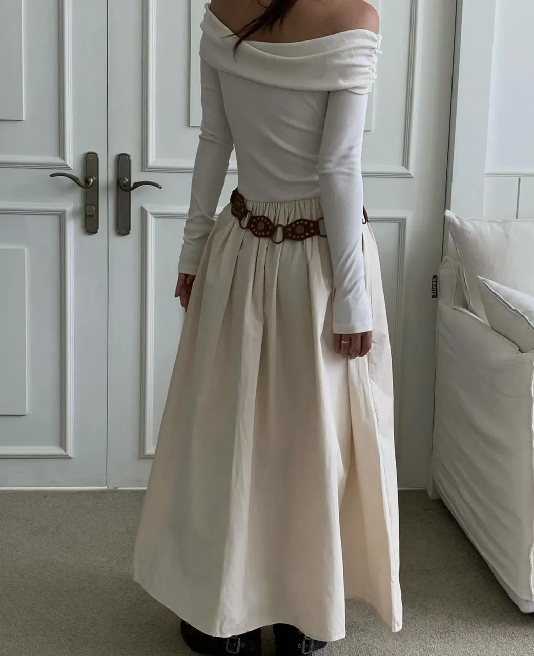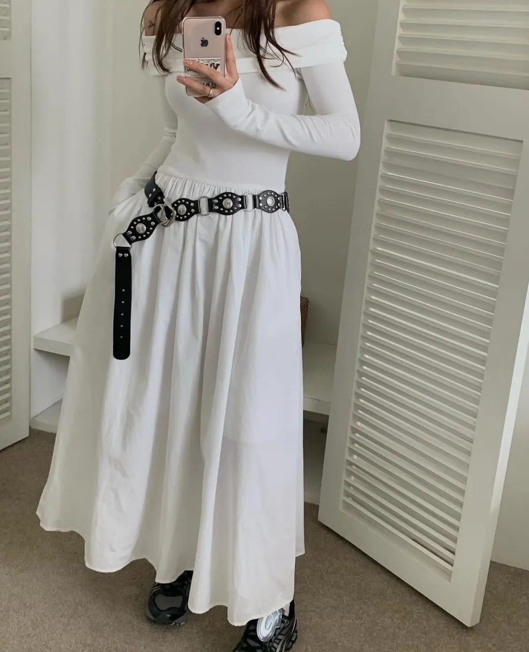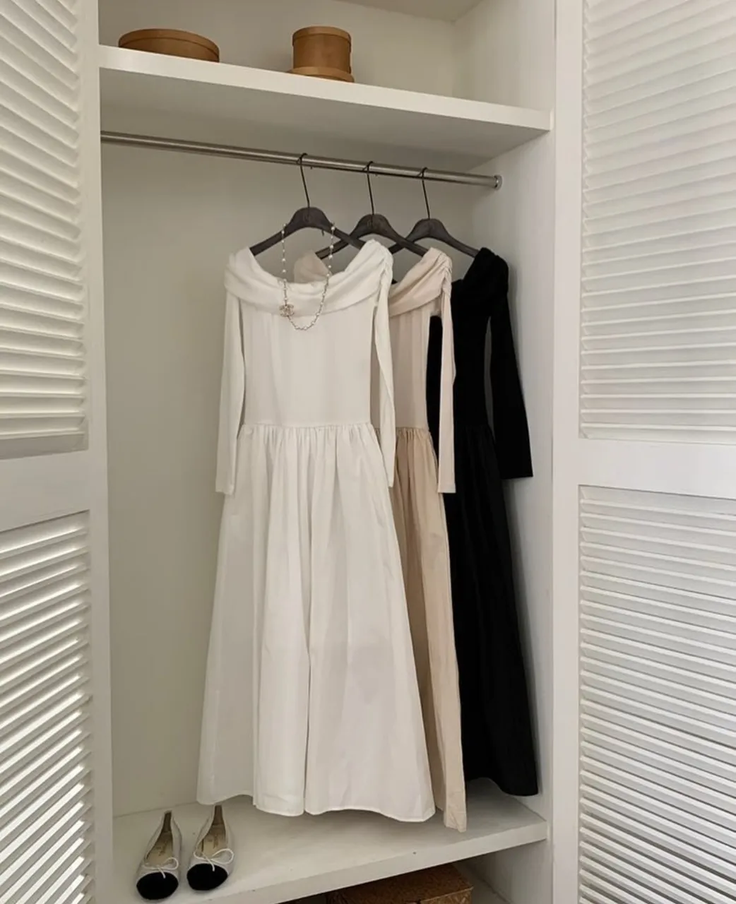 HI005 堆堆一字領拚荷葉連身長洋裝 3色