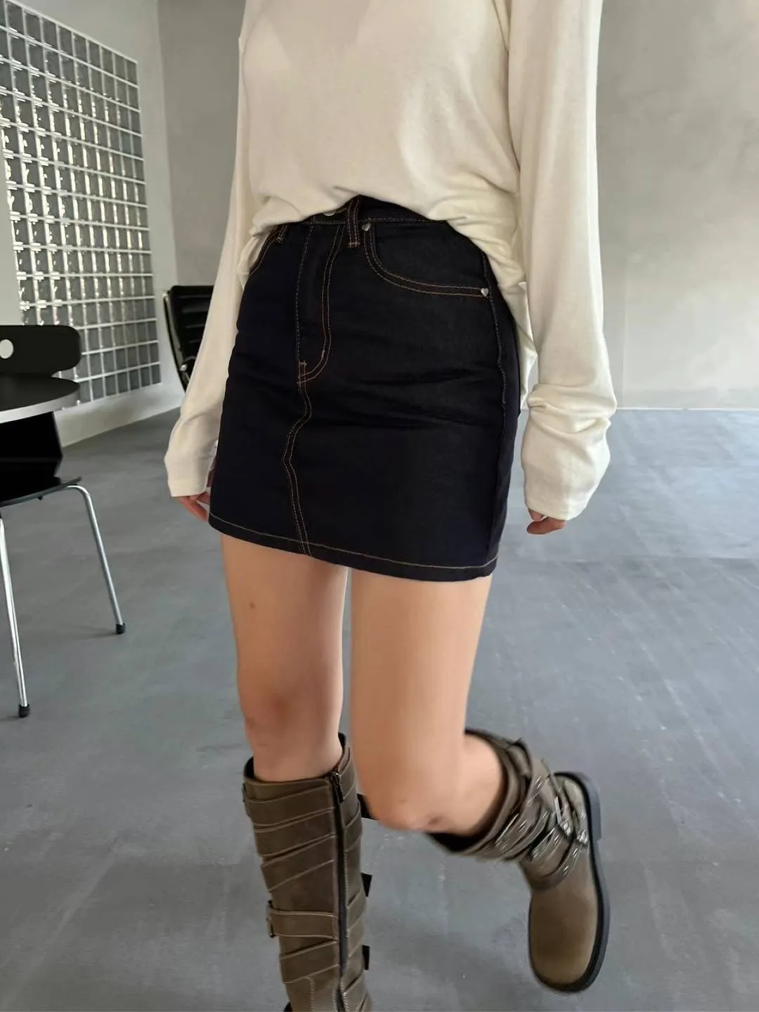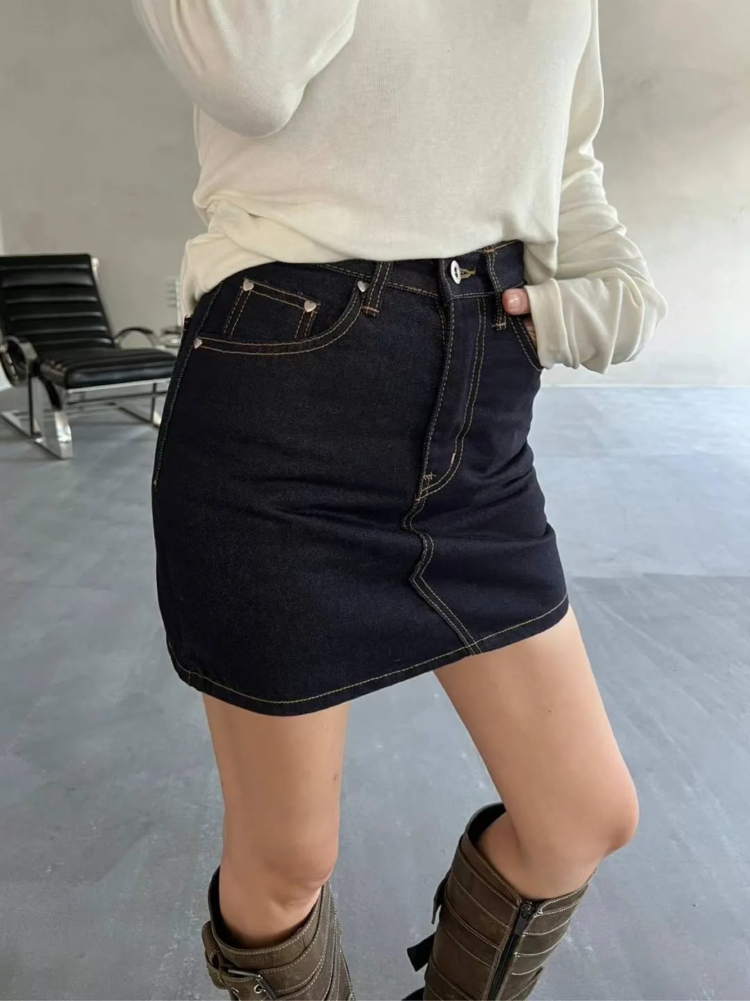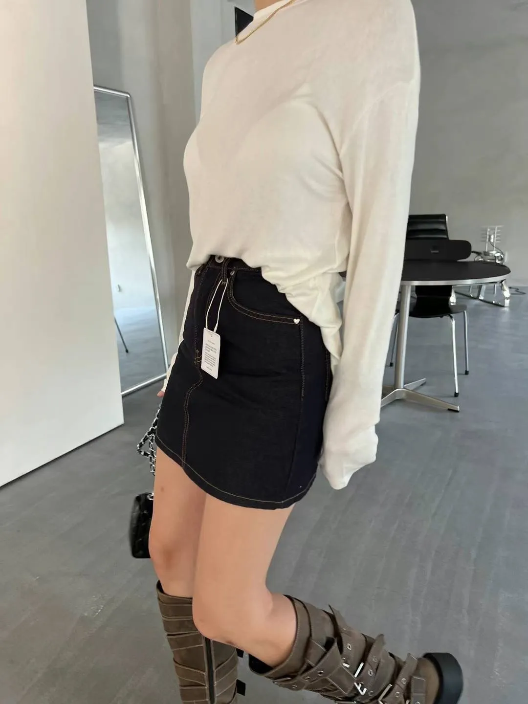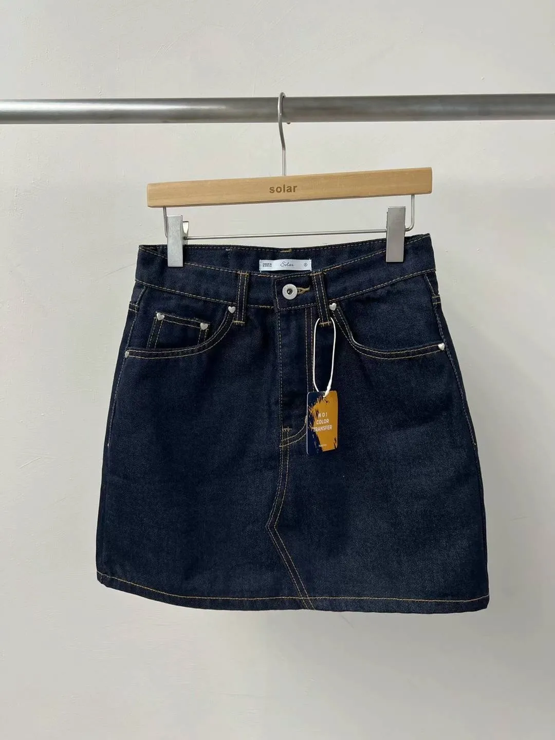 HK014 原色牛仔中高腰愛心釘扣短裙 SML
