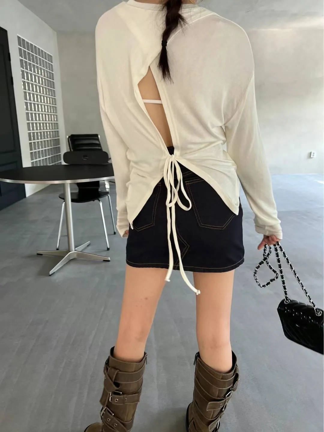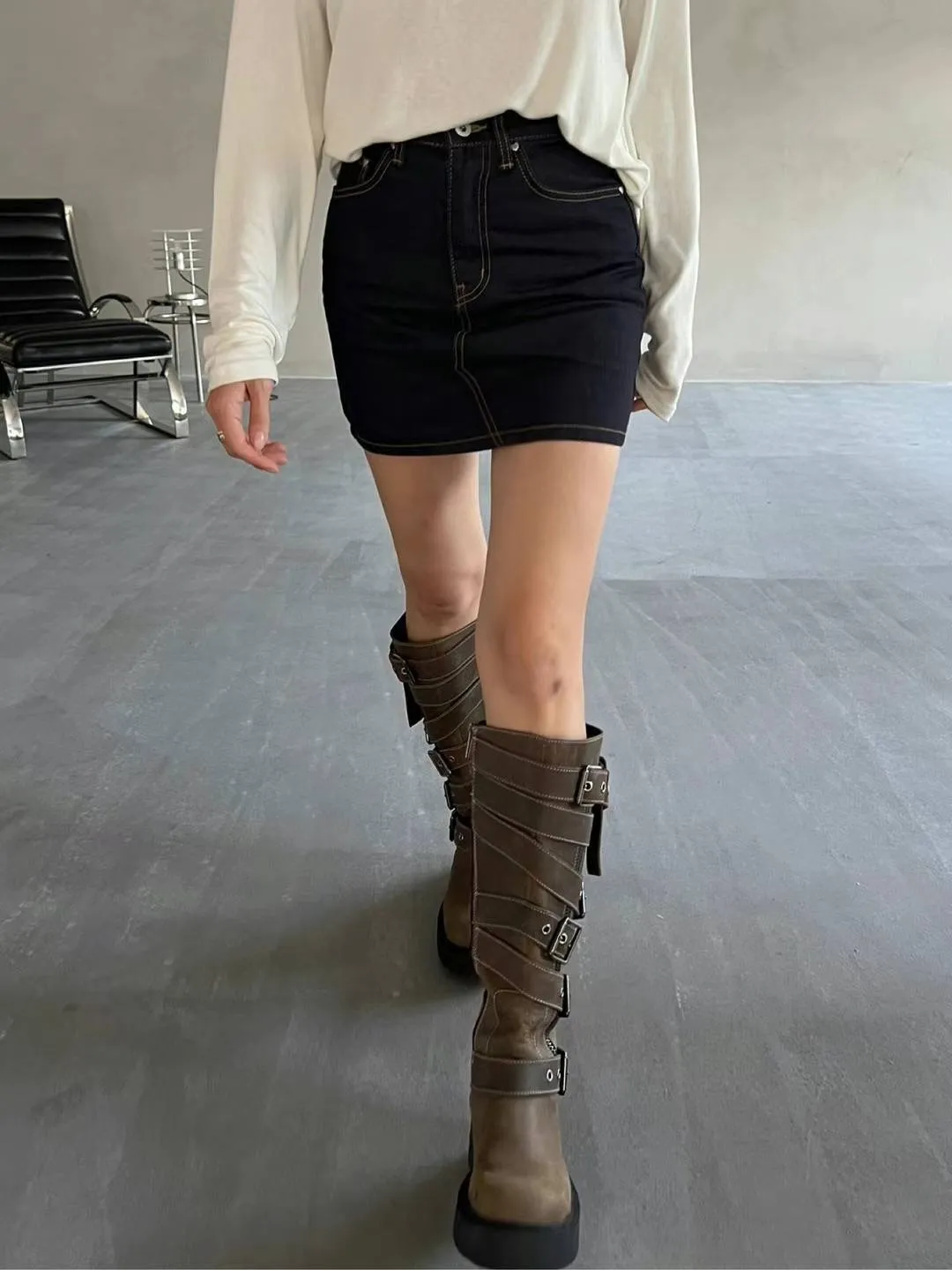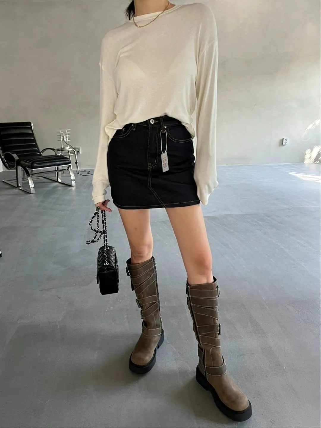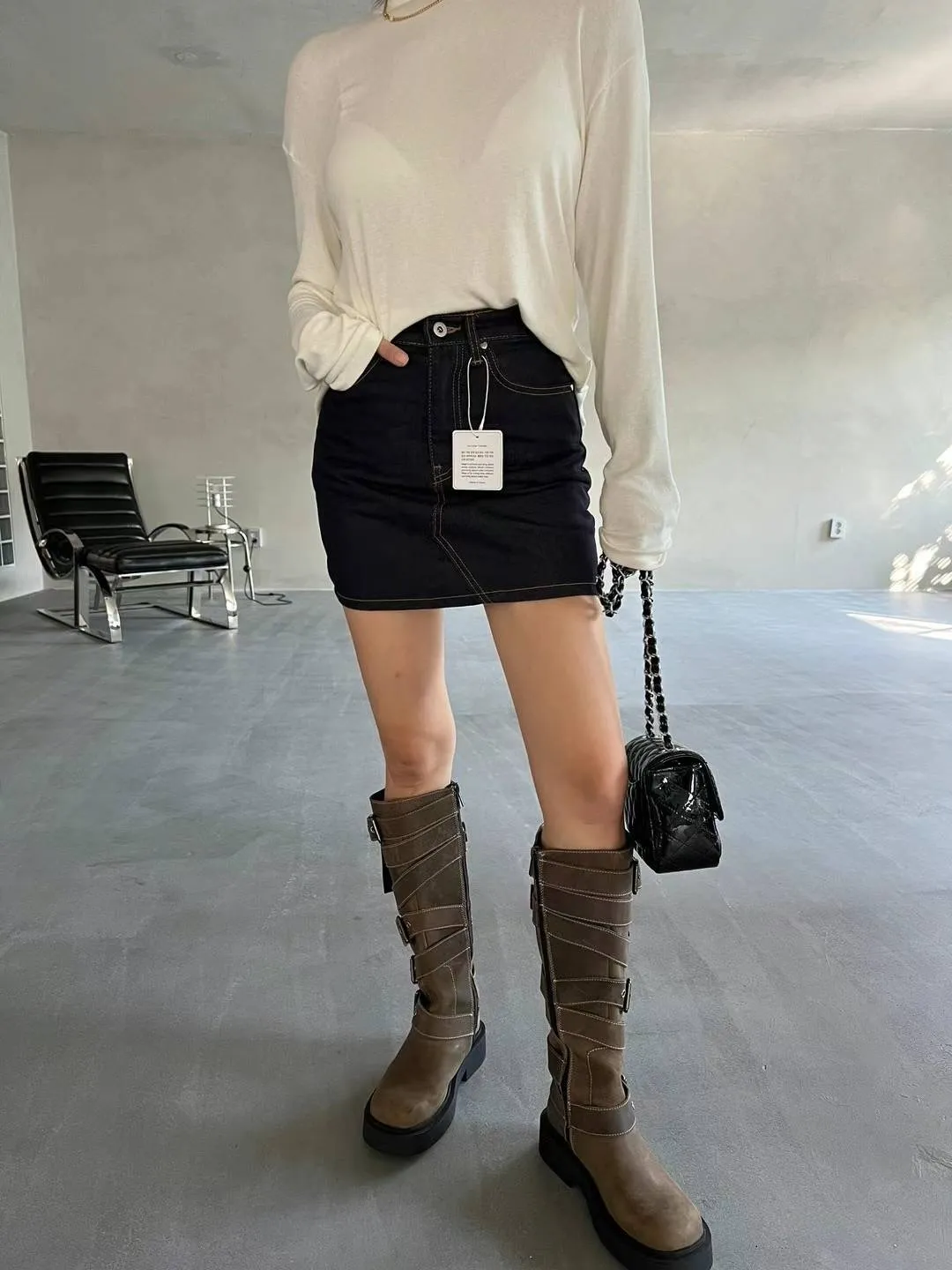 HK014 原色牛仔中高腰愛心釘扣短裙 SML