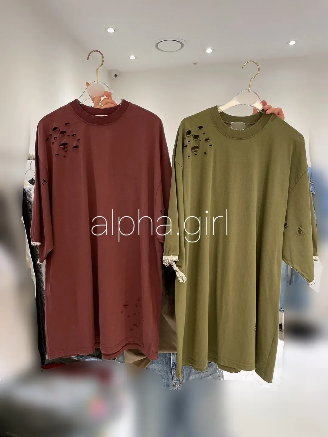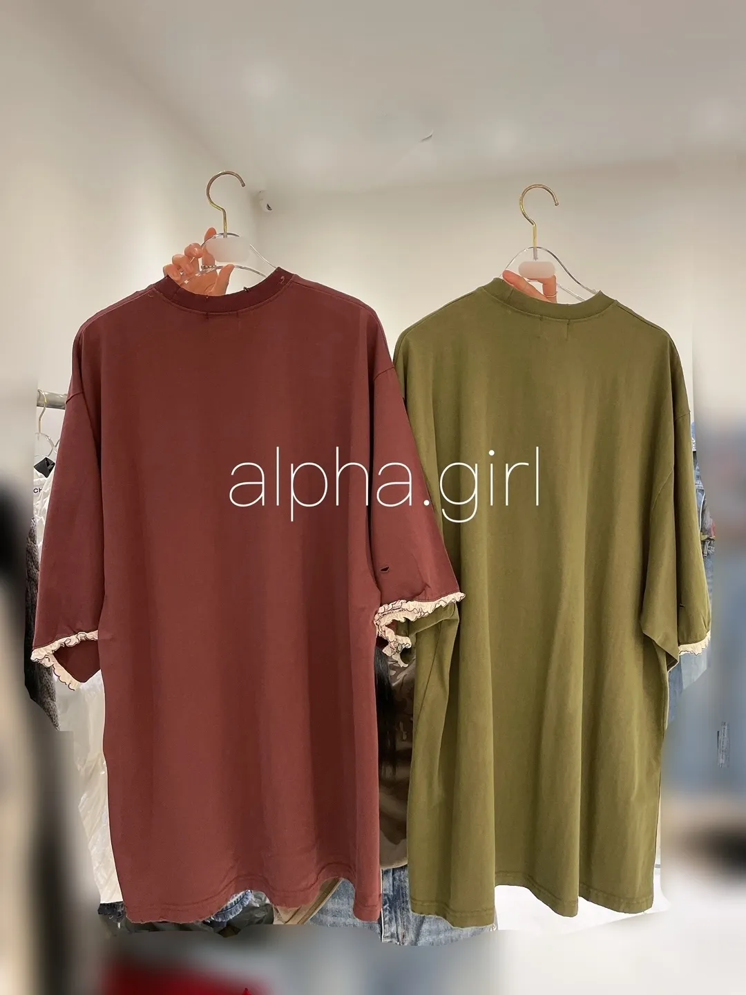 HS018 袖拚布蕾絲破壞中長版短T 2色