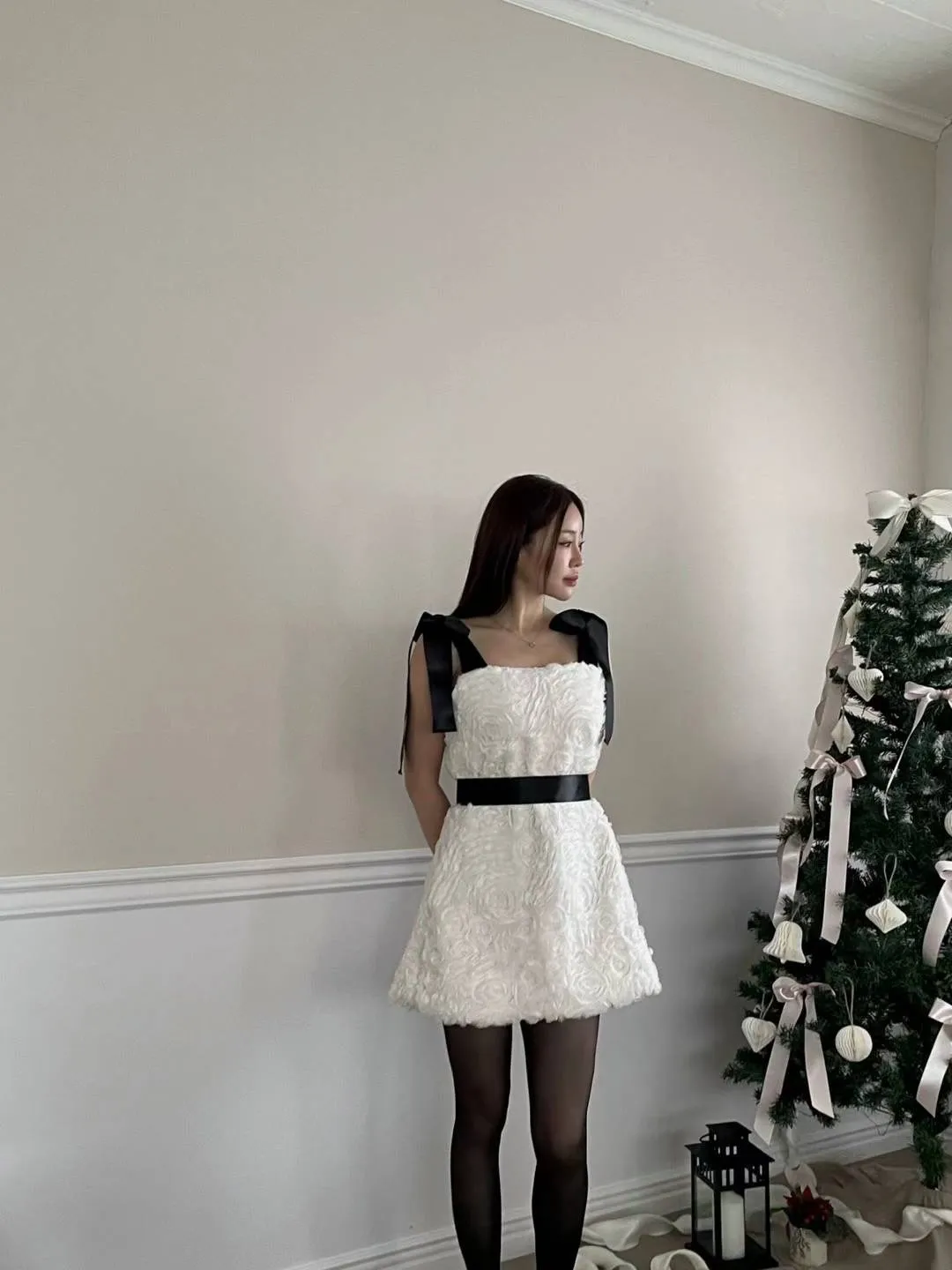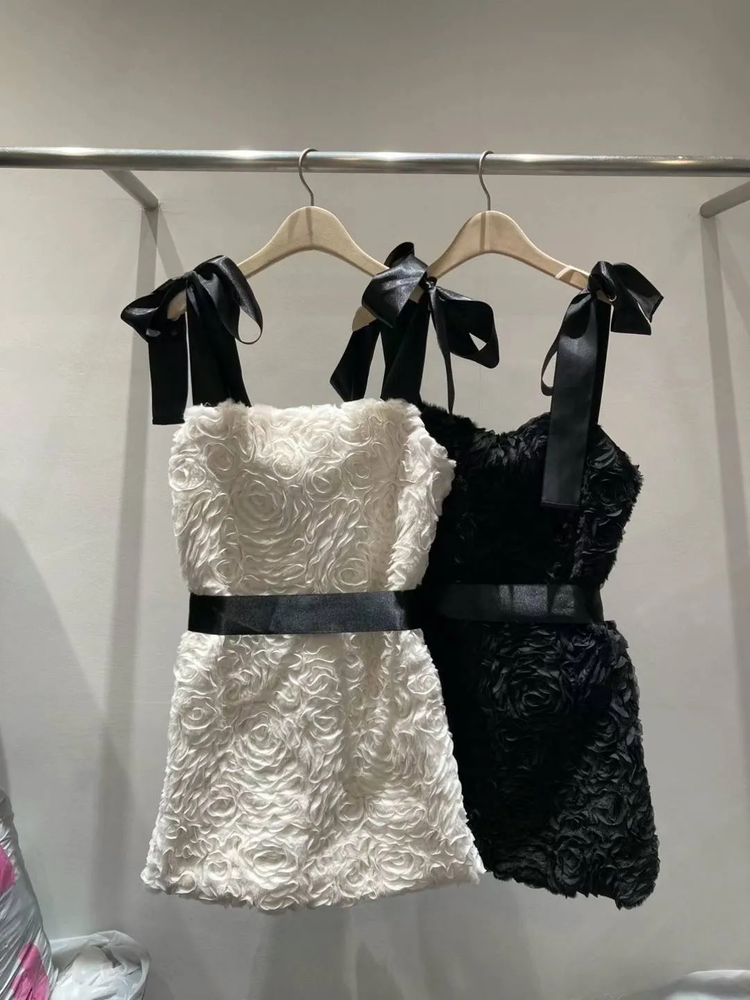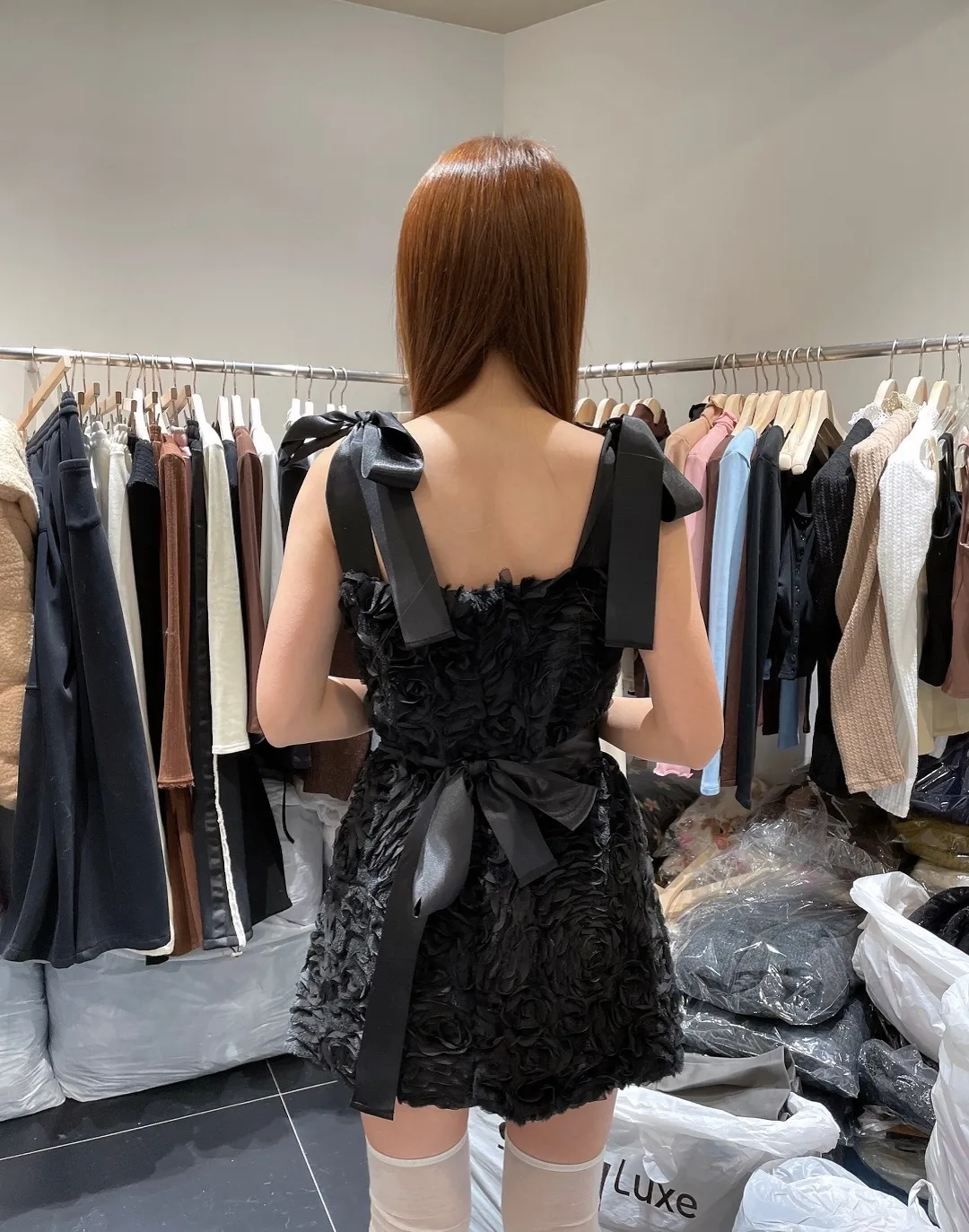 LC015 綁帶蝴蝶結背心薔薇紗連身短洋裝 2色
