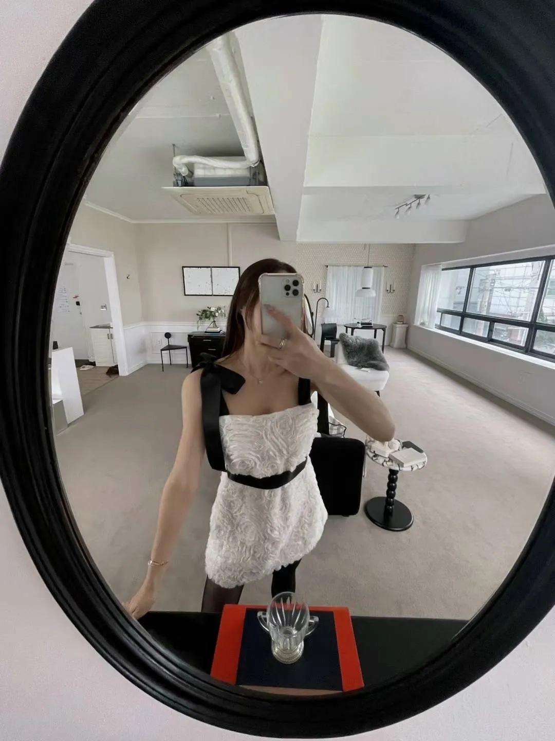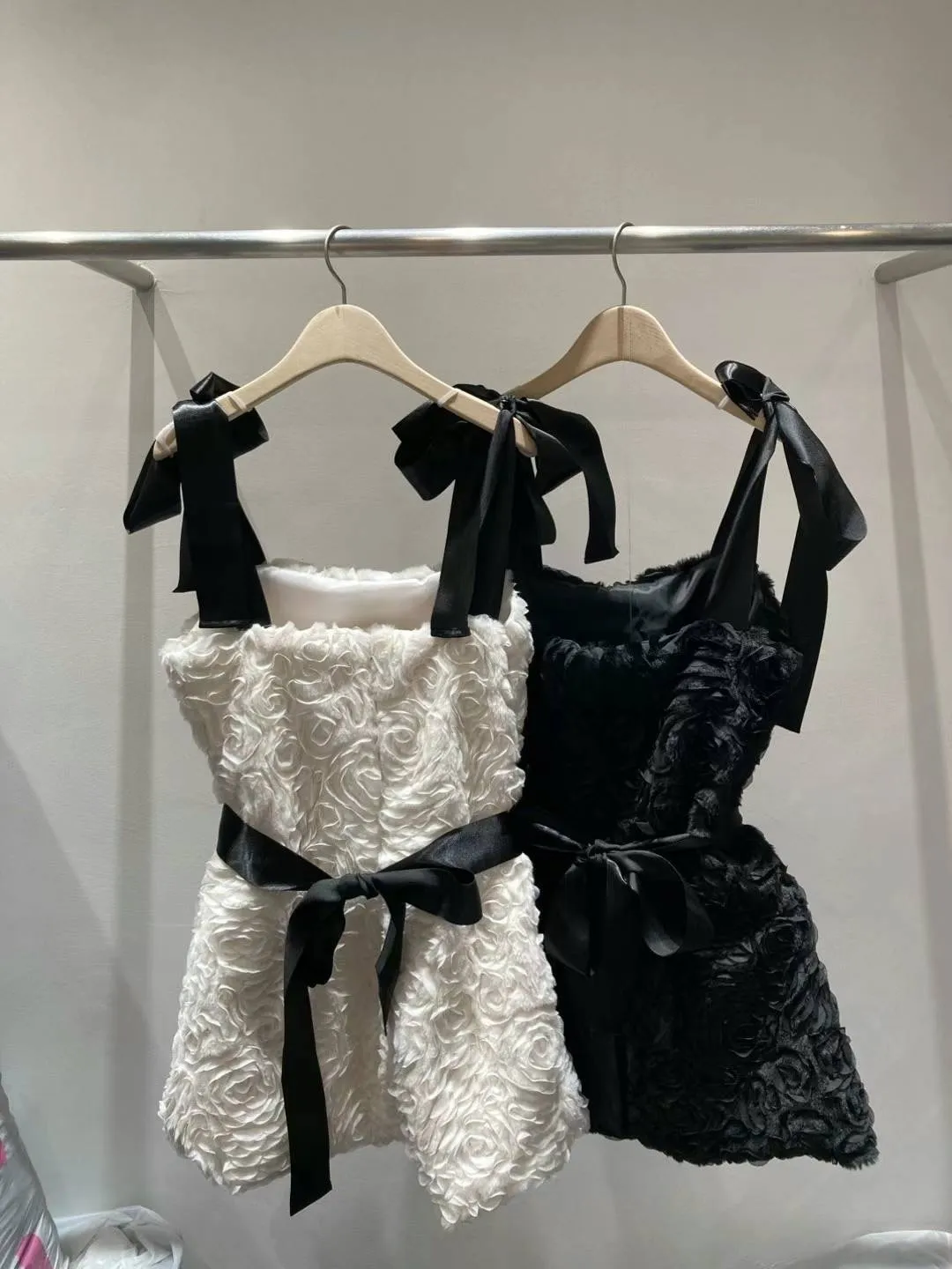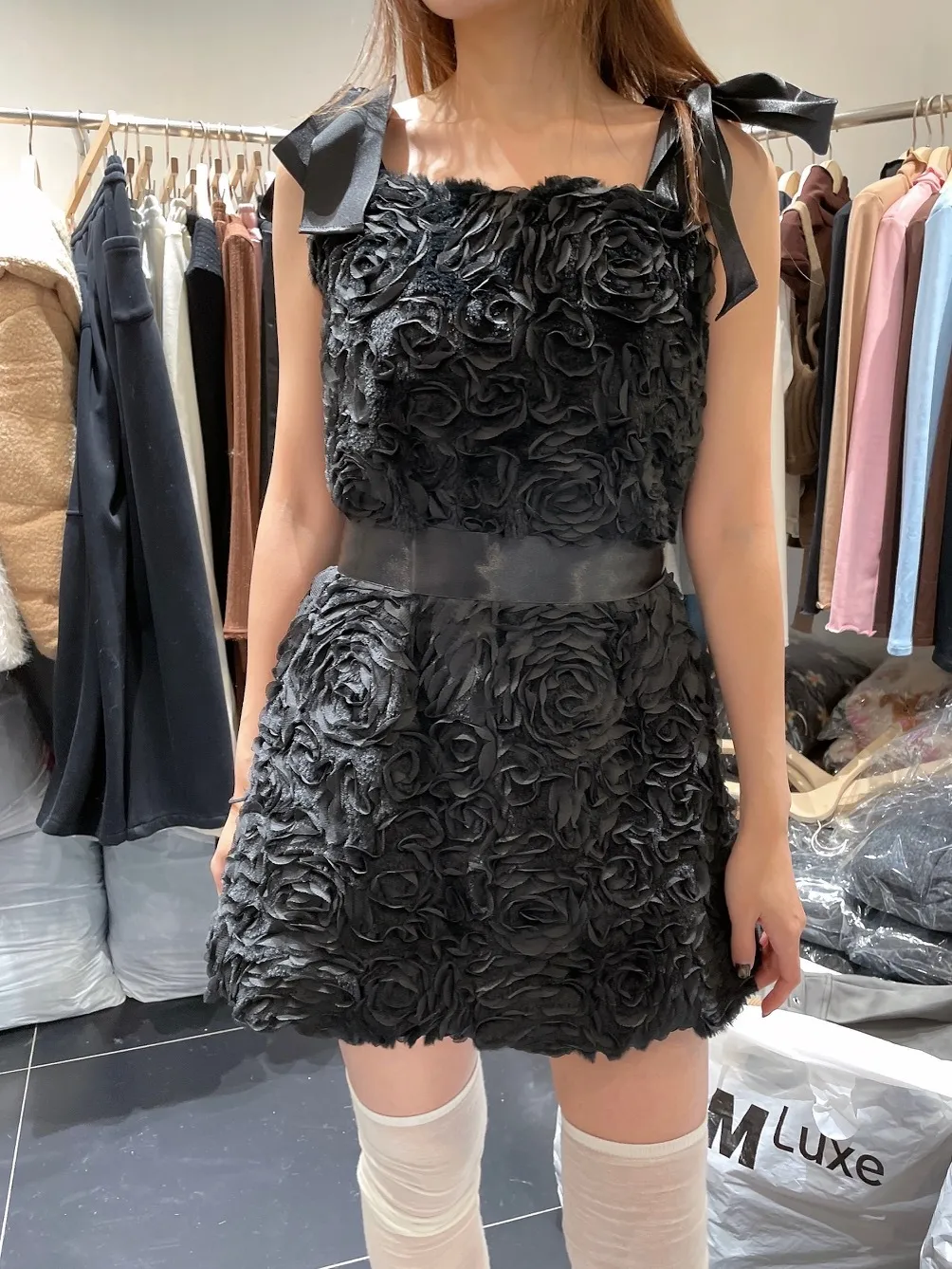 LC015 綁帶蝴蝶結背心薔薇紗連身短洋裝 2色